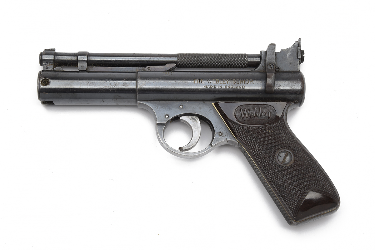 A .177 BARREL-COCKING AIR PISTOL SIGNED WEBLEY, MODEL 'SENIOR' serial no. 279, with a 6 3/4in. barrel, open sights, most of original bluing, bake lite pistol grips.