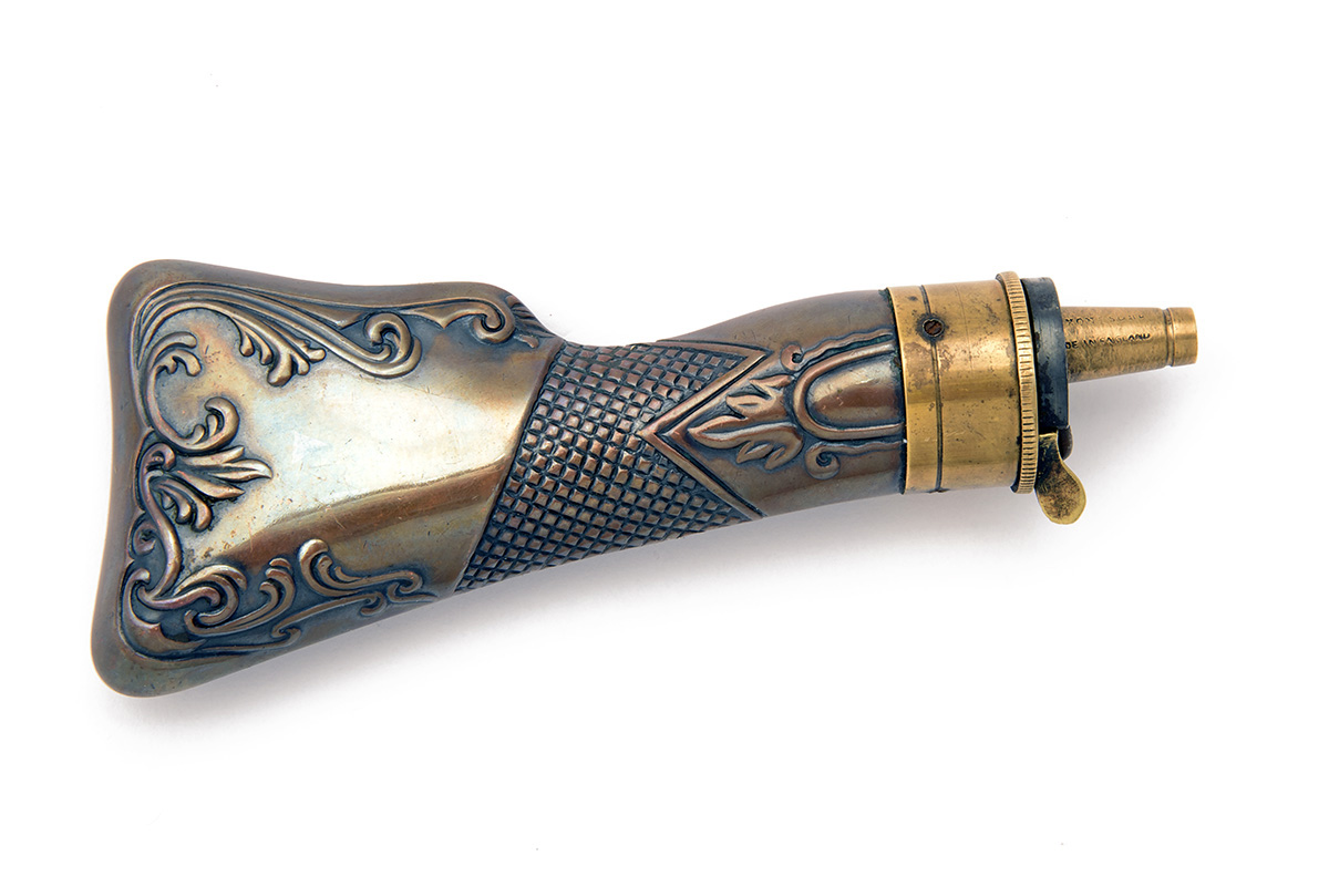 A GOOD REPRODUCTION JAMES DIXON BUTT-STOCK POWDER-FLASK OF SMALL SIZE,
