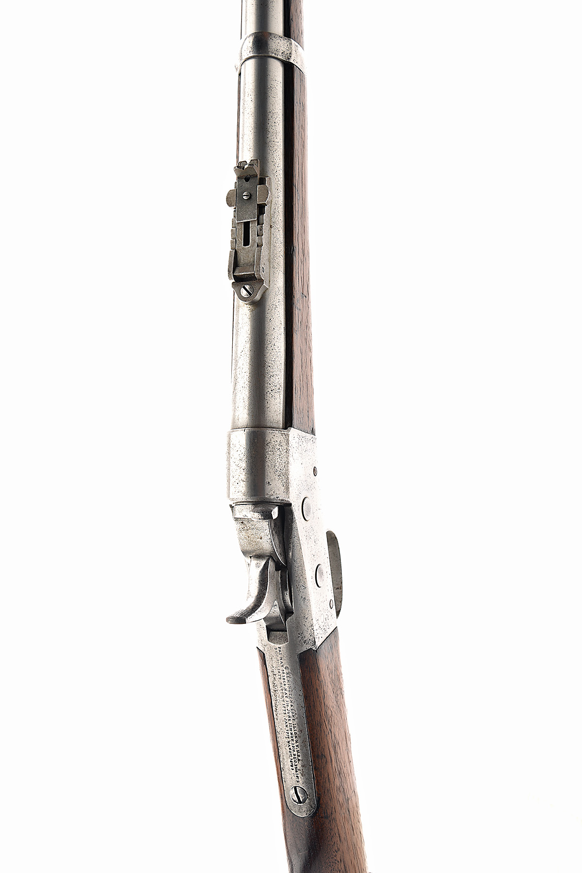 A 11 X 50MM (.43 EGYPTIAN) REMINGTON MODEL 1867 ROLLING BLOCK THREE BAND SERVICE RIFLE, CIRCA 1870, no visible serial number, 5 in. barrel, long bayonet bar at muzzle, block and blade front-sight and ladder rearsight, the action tang with Remington address and patent legend, regulation iron mounted two piece walnut stock, with rod, barrel and action polished bright, good stock lightly cleaned, action at fault.
