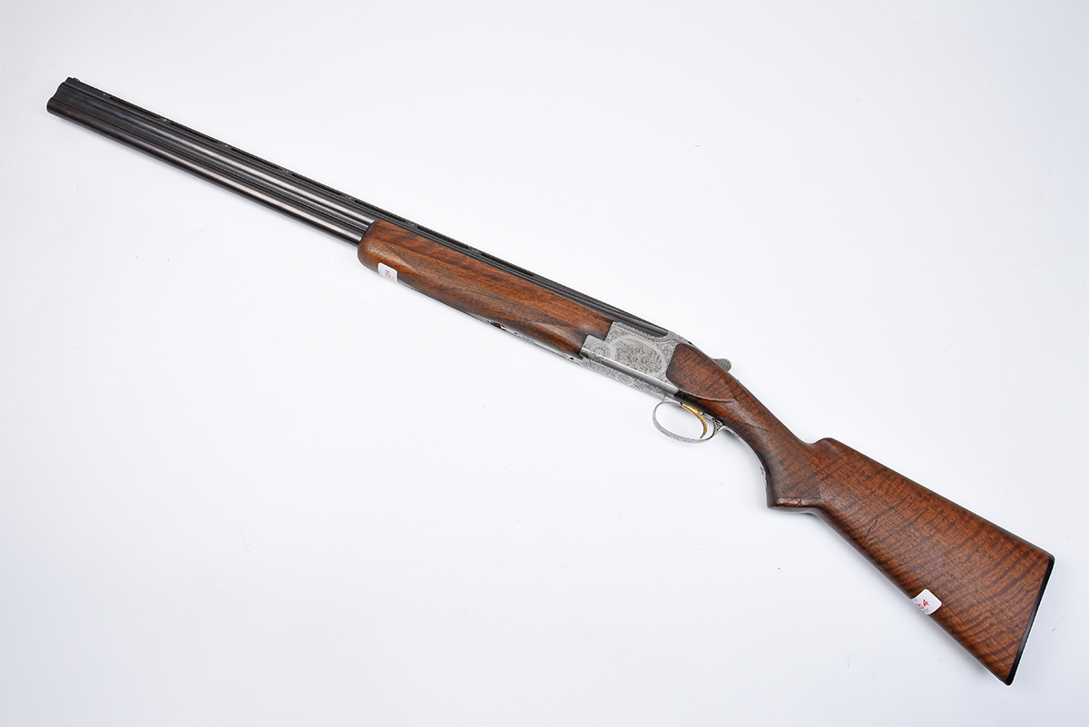 FABRIQUE NATIONALE 12-BORE 'B2' SINGLE-TRIGGER OVER AND UNDER EJECTOR, serial no. 30444S74, for 1974, 27 1/2in. nitro barrels with 12mm ventilated matt top-rib, 2 3/4in. chambers, bored approx. true cyl. in both, hold-open toplever, manual safety with integral barrel selector switch, chequered gold-washed trigger, acanthus scroll engraving surrounding game scenes of pheasant and duck, signed 'R. BEE' to the left, 14 3/8in. pistolgrip stock including buttplate, weight 7lb. 5oz.