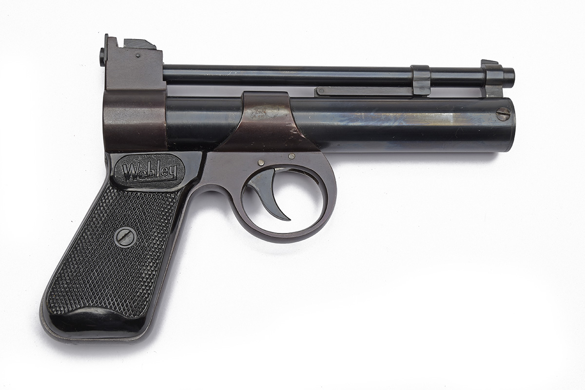 A BOXED .177 BARREL-LEVER AIR-PISTOL SIGNED WEBLEY & SCOTT, MODEL 'JUNIOR' batch no. 2748, with 6in. barrel, open sights, original blued finish, black plastic grips, boxed with instructions.