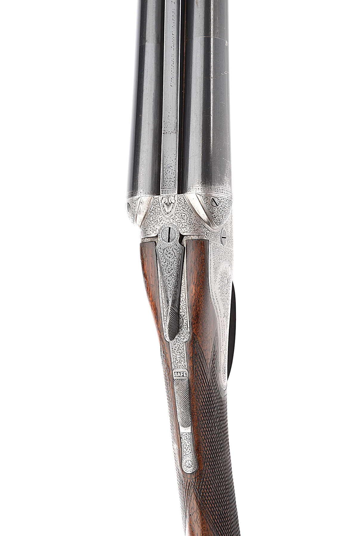CHARLES LANCASTER 12-BORE ASSISTED-OPENING BACK-ACTION SIDELOCK EJECTOR, serial no. 6819, circa 1892, 28in. sleeved nitro barrels, 2 3/4in. chambers, bored approx. 1/2 and 3/4 choke, Lancaster patent assisted-opening action, carved fences, striker discs, slim toplever, automatic safety, dipped-edge lockplates, fine border and acanthus scroll engraving, brushed finish, 15 5/8in. replacement stock, weight 6lb. 11oz., in its makers canvas and leather case