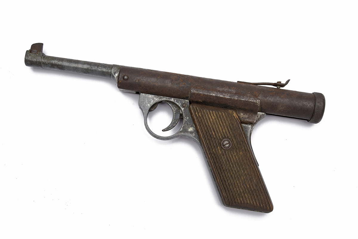 A RARE .177 RECEIVER-COCKING AIR-PISTOL SIGNED HAENAL, MODEL '26', serial no. 2212, manufactured between 1926-39, with drop-down 4in. barrel, lift-up to cock air-chamber (corroded externally), alloy frame and ribbed walnut grips