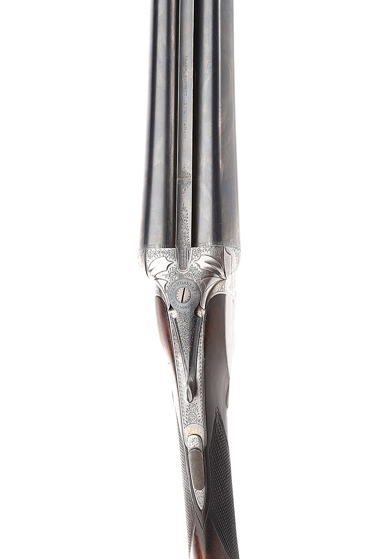 FRANK GARRETT 12-BORE BOXLOCK EJECTOR, serial no. 1017, circa 1900, 29in. nitro reproved barrels (left wall at 15), rib engraved 'FRANK GARRETT. BIRMINGHAM.', 2 1/2in. chambers, bored approx. imp. cyl. and 1/4 choke, treble-grip action, carved stylised acanthus leaf fences, automatic safety with gold-inlaid 'SAFE' detail, border and acanthus scroll engraving, brushed finish, 14 1/2in. stock including buttplate, weight 6lb. 8oz., in its makers leather case