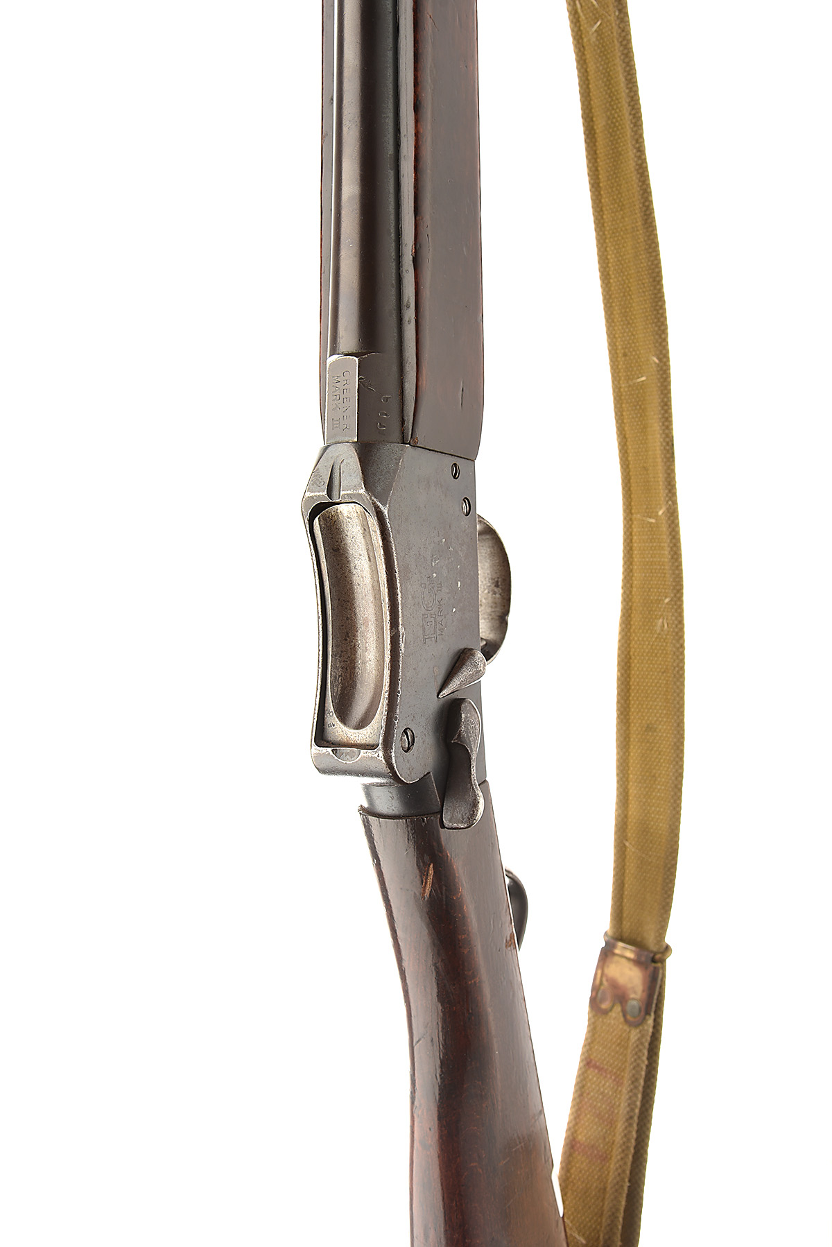 W.W. GREENER 14 1/2-BORE 'E.G. MARK III' MARTINI-ACTION SHOTGUN, serial no. 40932, circa 1930, 26in. nitro barrel for the 14-bore Greener special bottle-necked cartridge, bored approx. 1/4 choke, plain blacked action, stamped ''W.W. GREENER. MAKER. PATENT No. 463628/35' and 'EG. MARK III.', 14 1/4in. stock including brass buttplate with central hinged trapdoor, full-length fore-end, canvas sling