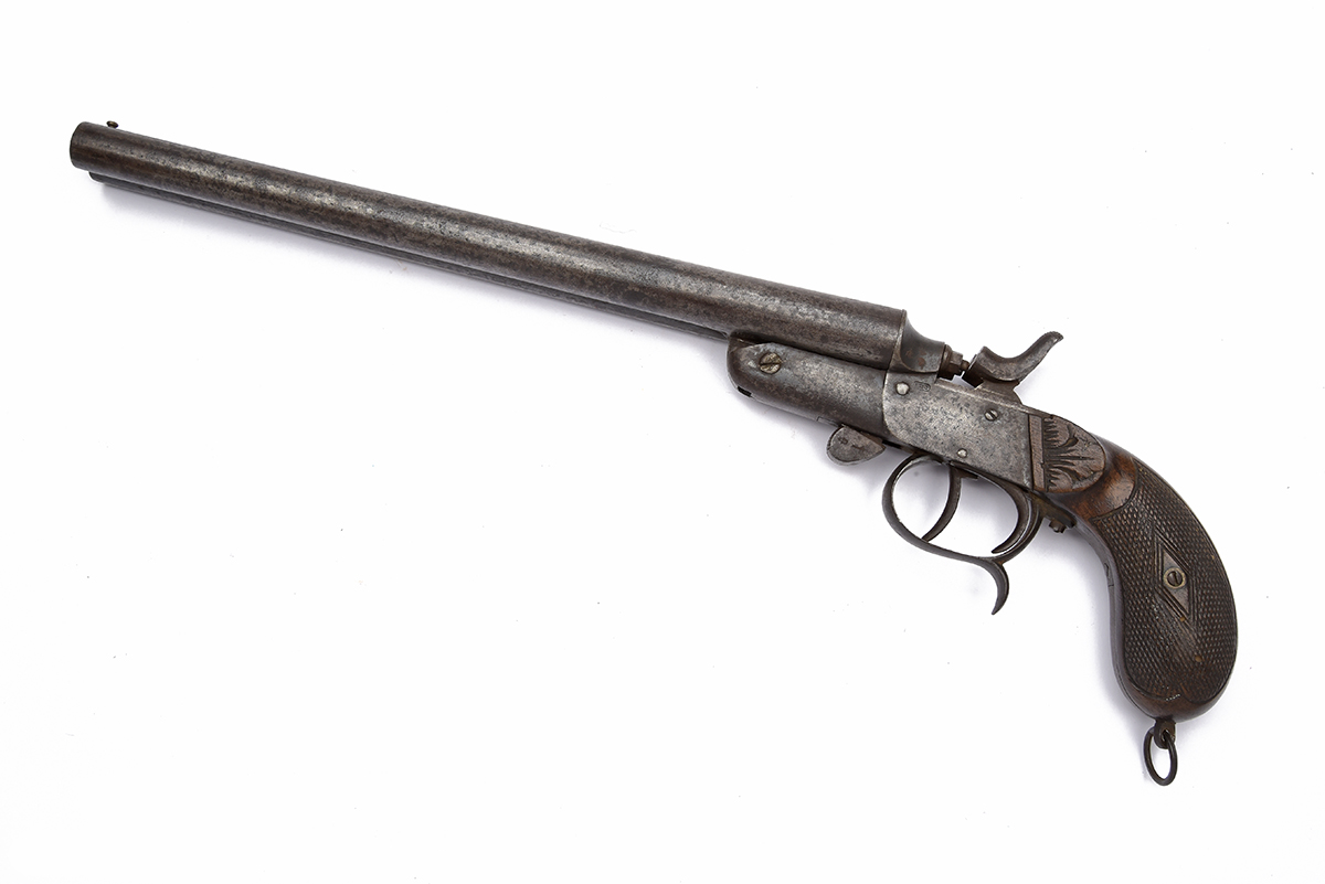 A .410 (2IN.) DOUBLE BARRELLED HAMMER SHOT-PISTOL, UNSIGNED, serial no. 22, circa World War One, with 9 1/2in. barrels (some pitting), boxlock action with twin hammers and twin triggers and chequered walnut bag-shaped butt, finish worn