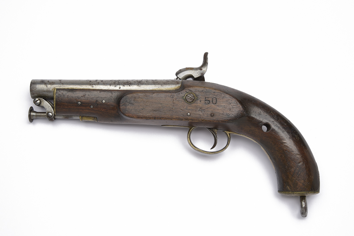 A .550 PERCUSSION PISTOL SIGNED TOWER, MODEL 'COASTGUARD' or 'CONSTABULARY', serial no. 50, dated for 1845, with 6in, brushed bright round barrel, borderline engraved lock of flint form, walnut full-stock bored through the grip for lanyard and stamped '50', brass furniture and captive iron ramrod