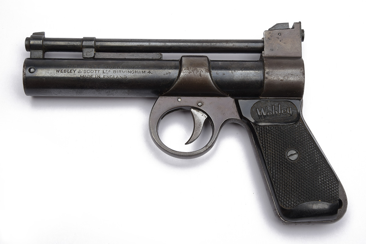 A .177 BARREL-COCKING AIR-PISTOL SIGNED WEBLEY & SCOTT, MODEL 'JUNIOR', batch no. 1697, with 6in. smoothbore barrel, adjustable rear-sight, blued air-chamber and chequered hard rubber grips, strong traces of finish remaining