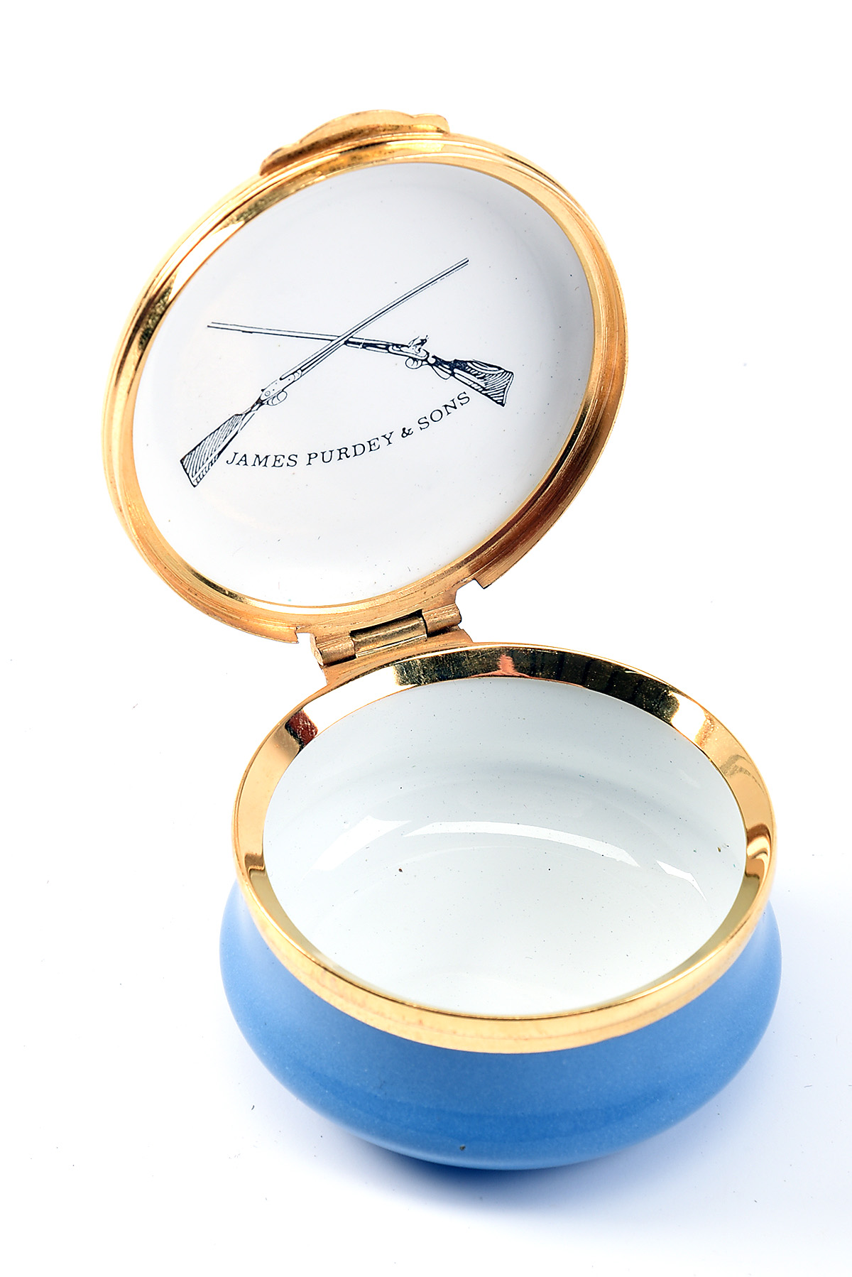 A CRUMMLESS & CO. ENAMEL & GOLD PILLBOX WITH JAMES PURDEY PILL BOX, the top decorated with a shooting scene, the lid interior with 'JAMES PURDEY'
