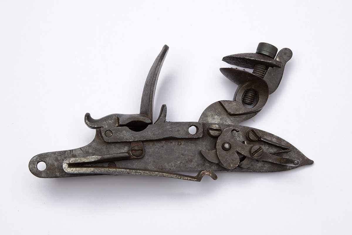 AN ISOLATED LOCK ONLY FROM A FLINTLOCK PISTOL SIGNED 'WILSON', dated for 1802 and probably from a New Land Pattern type, apparently complete but mainspring disengaged