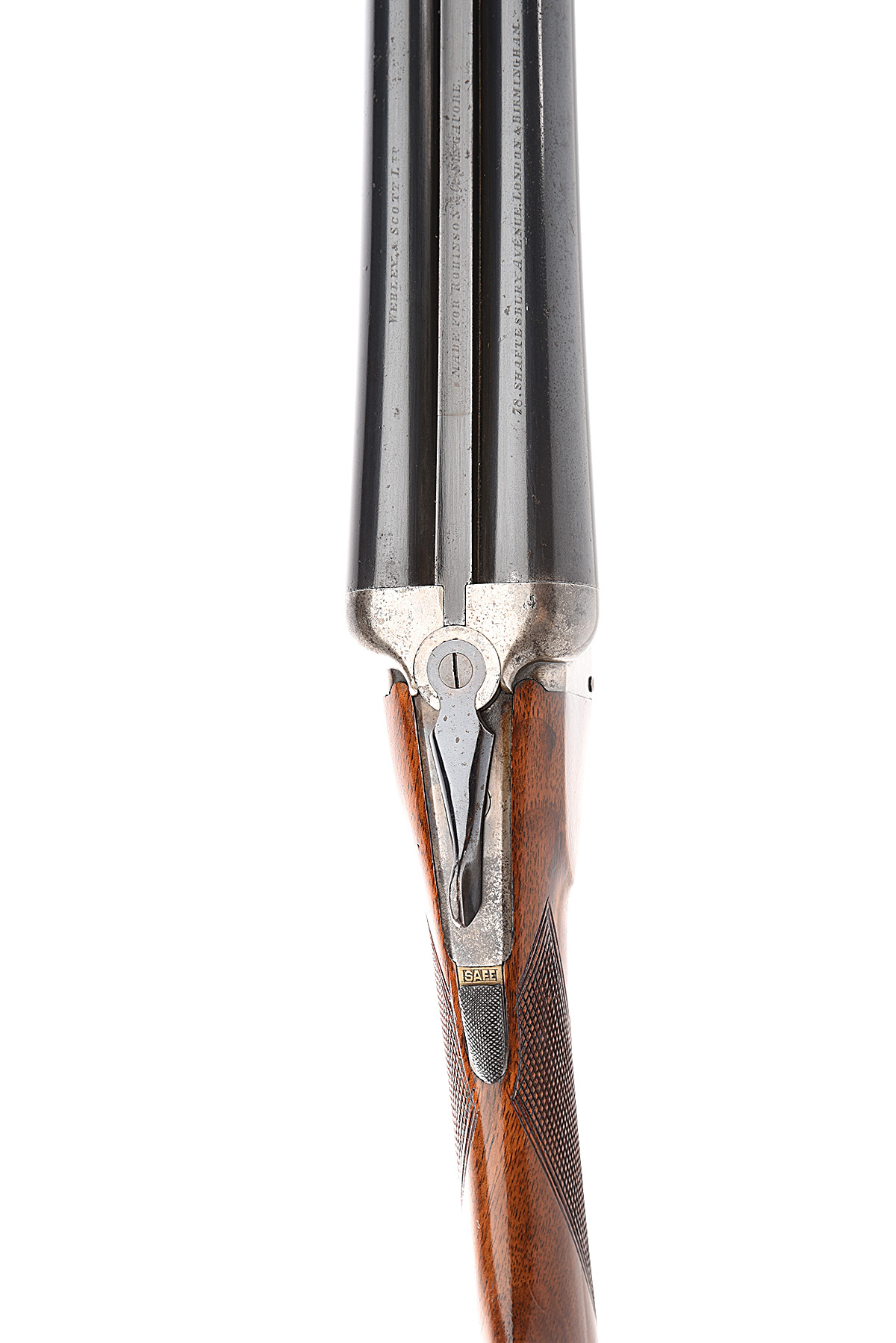 WEBLEY & SCOTT 12-BORE BOXLOCK EJECTOR, MADE FOR ROBINSON & CO. SINGAPORE, serial no. 90556, circa 1915, 30in. nitro barrels, tubes engraved 'MADE FOR ROBINSON & CO. SINGAPORE.', the tubes engraved 'WEBLEY & SCOTT LTD. 78. SHAFTESBURY AVENUE. LONDON & BIRMINGHAM.', 2 1/2in. chambers, bored approx. true cyl. and full choke, treble-grip action, removable striker discs, automatic safety, 15in. stock, weight 7lb., in a C.B. Vaughan canvas and leather case