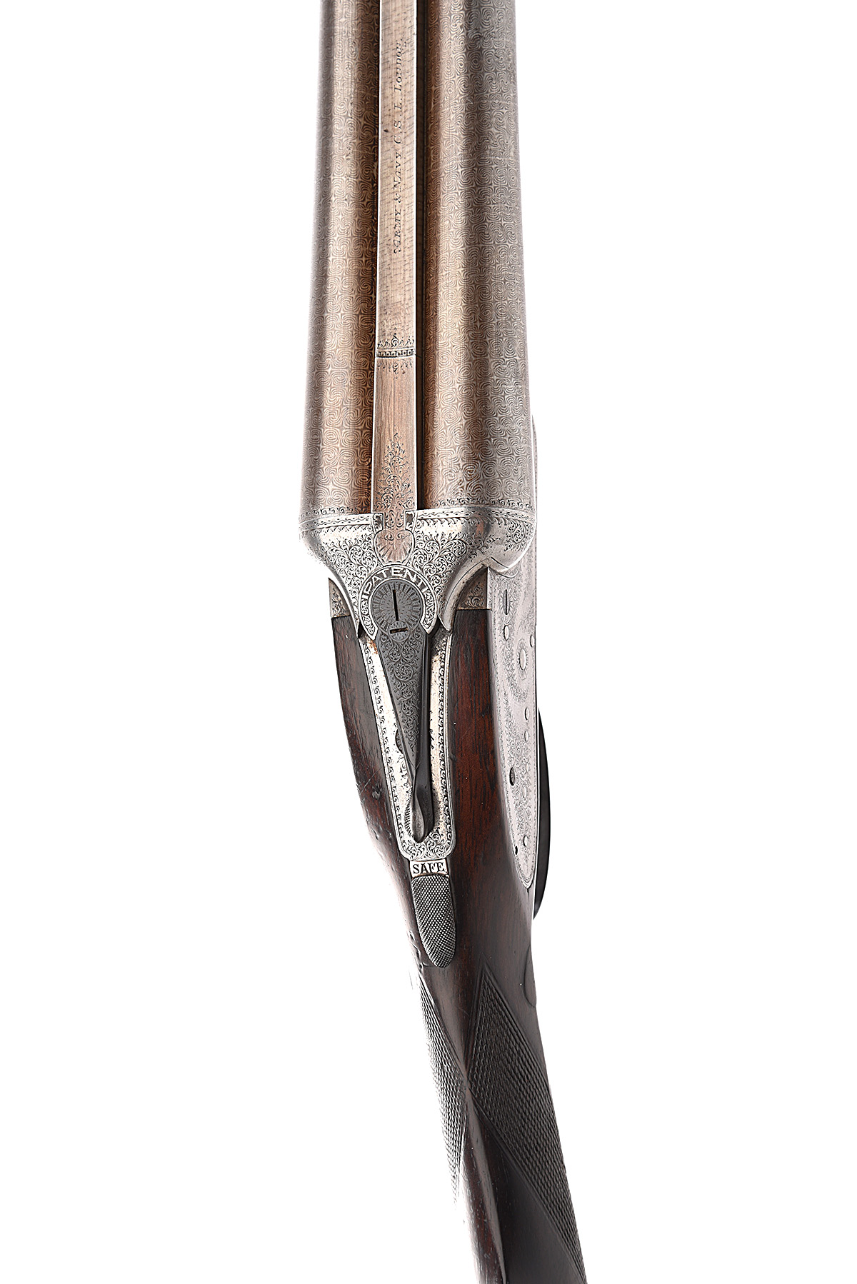 ARMY & NAVY 12-BORE SIDELOCK EJECTOR, serial no. 23830, circa 1900, 30in. nitro reproved damascus barrels, the rib engraved 'ARMY & NAVY. C.S.L. LONDON.' and with acanthus scroll detailing at the breech end, 2 1/2in. chambers, bored approx. true cyl. and full choke, (right wall at 15), treble-grip action, automatic safety with 'SAFE' detail, border and acanthus scroll engraving, bright finish, 14 1/2in. figured stock including buttplate, weight 6lb. 10oz.