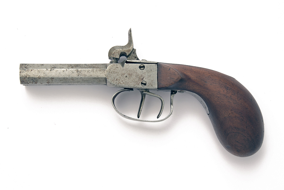 A 60-BORE PERCUSSION DOUBLE-BARRELLED TRAVELLING-PISTOL, UNSIGNED, no visible serial number, French or Belgian circa 1860, with brushed bright side by side octagonal2 5/8in. barrels, plain boxlock action with twin central hammers and guarded triggers and smooth walnut bag-shaped butt
