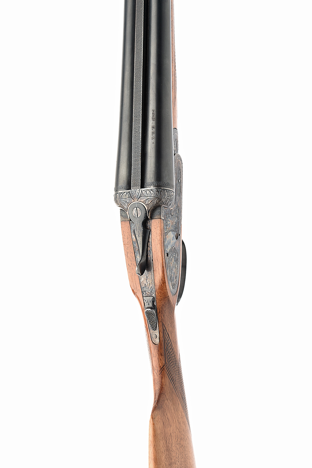 MENDI S.C.I. 12-BORE SIDELOCK NON-EJECTOR, serial no. 44917, for 1973, 27 1/2in. (70cm) nitro barrels, 2 3/4in. chambers, bored approx. 1/4 and 3/4 choke, treble-grip action with hidden third-bite, gas checks, automatic safety, border and scroll engraving, retaining much colour-hardening and finish, 15 1/4in. stock including 1 1/4in. ventilated rubber recoil pad