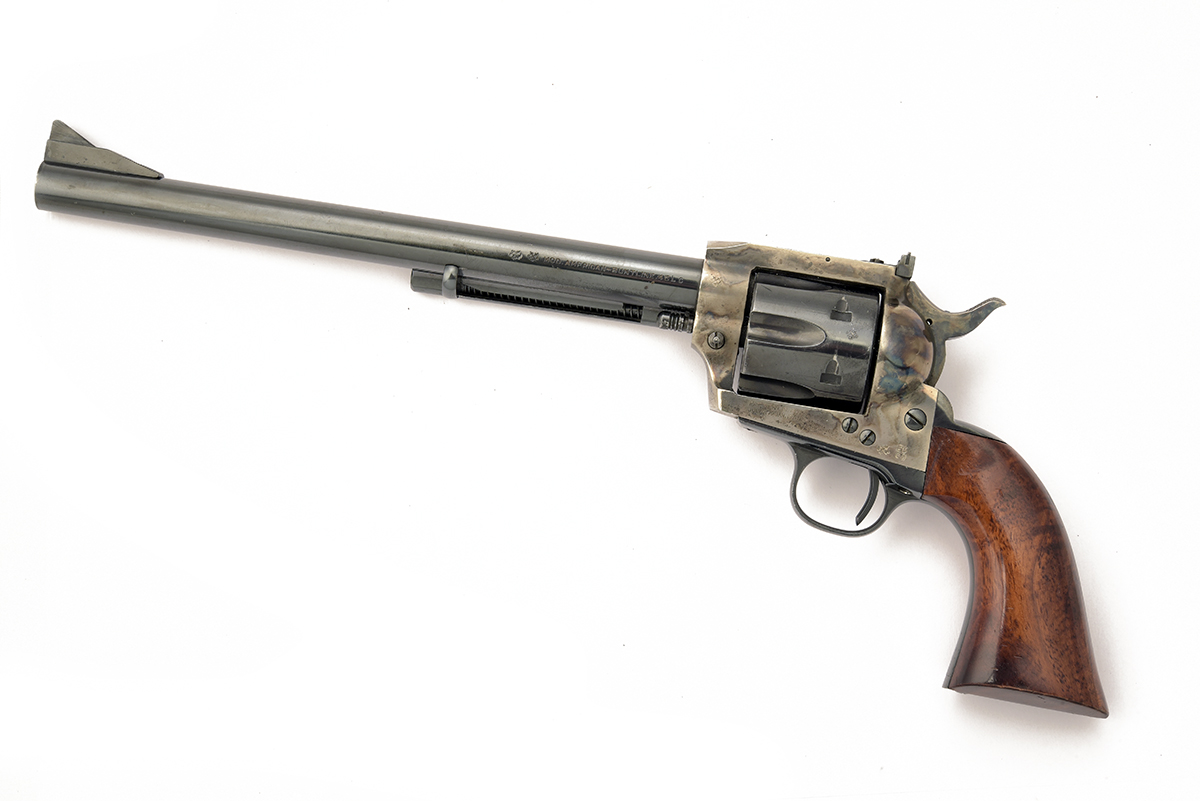 A DEACTIVATED REPRODUCTION REVOLVER, MODEL 'AMERICAN BUNTLINE COLT', serial no. 155776, with blued 10in. barrel, adjustable sights, colour hardened solid frame, blued fluted cylinder and smooth walnut grip, complete with its E.U. specification deactivation certificat and a tooled leather open-top holster
