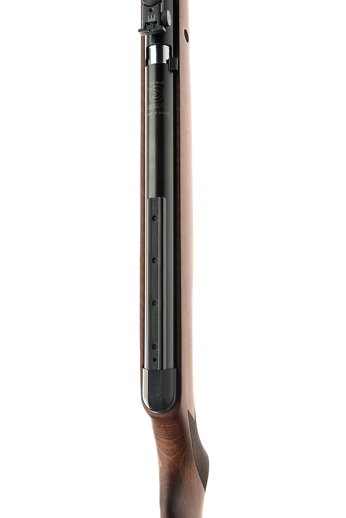 A .22 BREAK-BARREL AIR-RIFLE, SIGNED GAMO 'MODEL CFX ROYAL', serial no. 04-1C-093325-04, 20in. barrel with built on sound moderator, high-visibility fore-sight, adjustable open rear sight, blued receiver with raised sight rail, manual safety, blued finish, chequered pistolgrip stock with cheekpiece, 14 1/4in. pull including ventilated rubber recoil pad, the whole appearing unused in its makers carton
