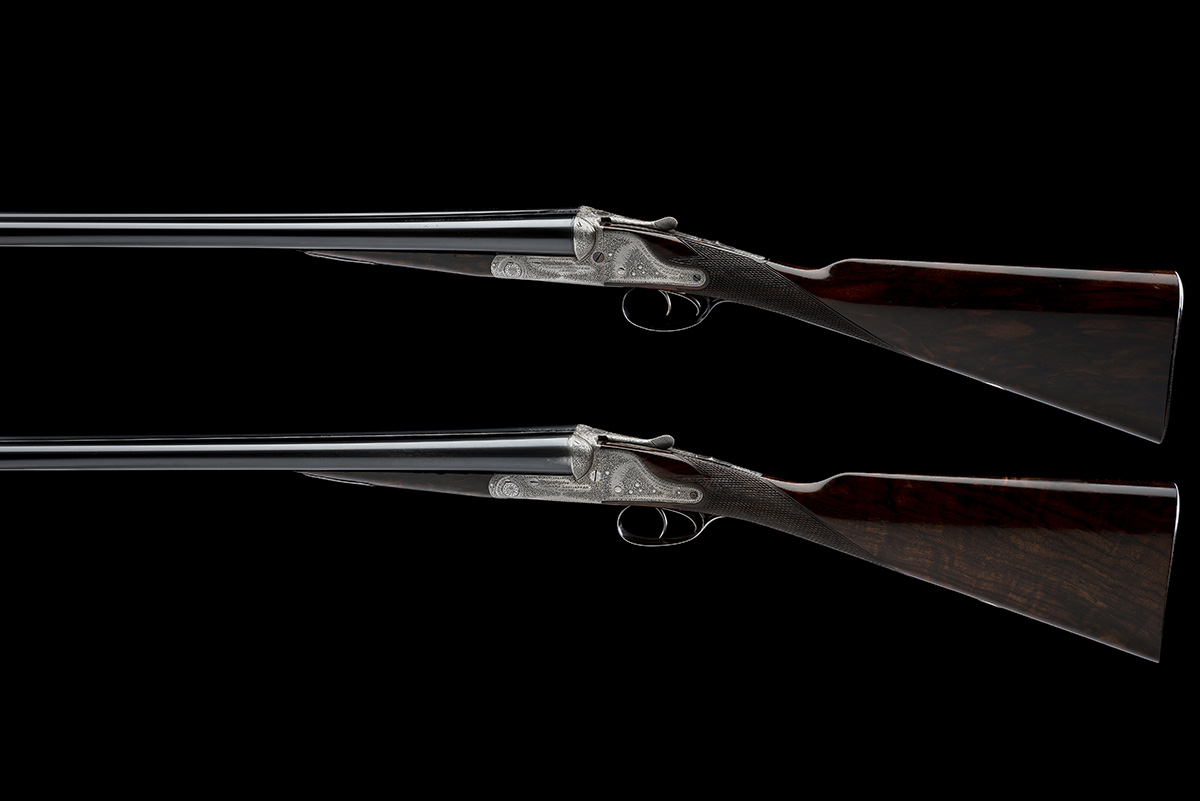 for 1900, 30in. Whitworth-steel nitro barrels, barrels no. 8600 with likely replacement rib, the tubes later engraved 'CHARLES LANCASTER. 7 BURY STREET. ST. JAMES'S. LONDON. ENGLAND.', barrels no. 8601 rib engraved 'CHARLES LANCASTER 151 NEW BOND ST. LONDON. PATENT EJECTOR', and silver-inlaid '4' at the breech end, under ribs engraved 'BARRELS MADE OF SIR JOSEPH WHITWORTH'S FLUID PRESSED STEEL', (rubbed on barrels no. 8600), 2 1/2in. chambers, bored approx. imp. cyl. and 1/2 choke, some pits No. 8601, Lancaster patent assisted-opening actions with slender toplevers, automatic safeties with inlaid 'SAFE' plaques, bold border and acanthus scroll engraving, brushed finish overall, No. 8600 ejectors require attention, 14 1/4in. replacement stocks, fore-ends with grip-catch release levers, woods with insert repairs and chequering worn smooth, weight 6lb. 12oz. (No. 8600) and 6lb. 14oz. (No. 8601), in their brass-cornered leather case