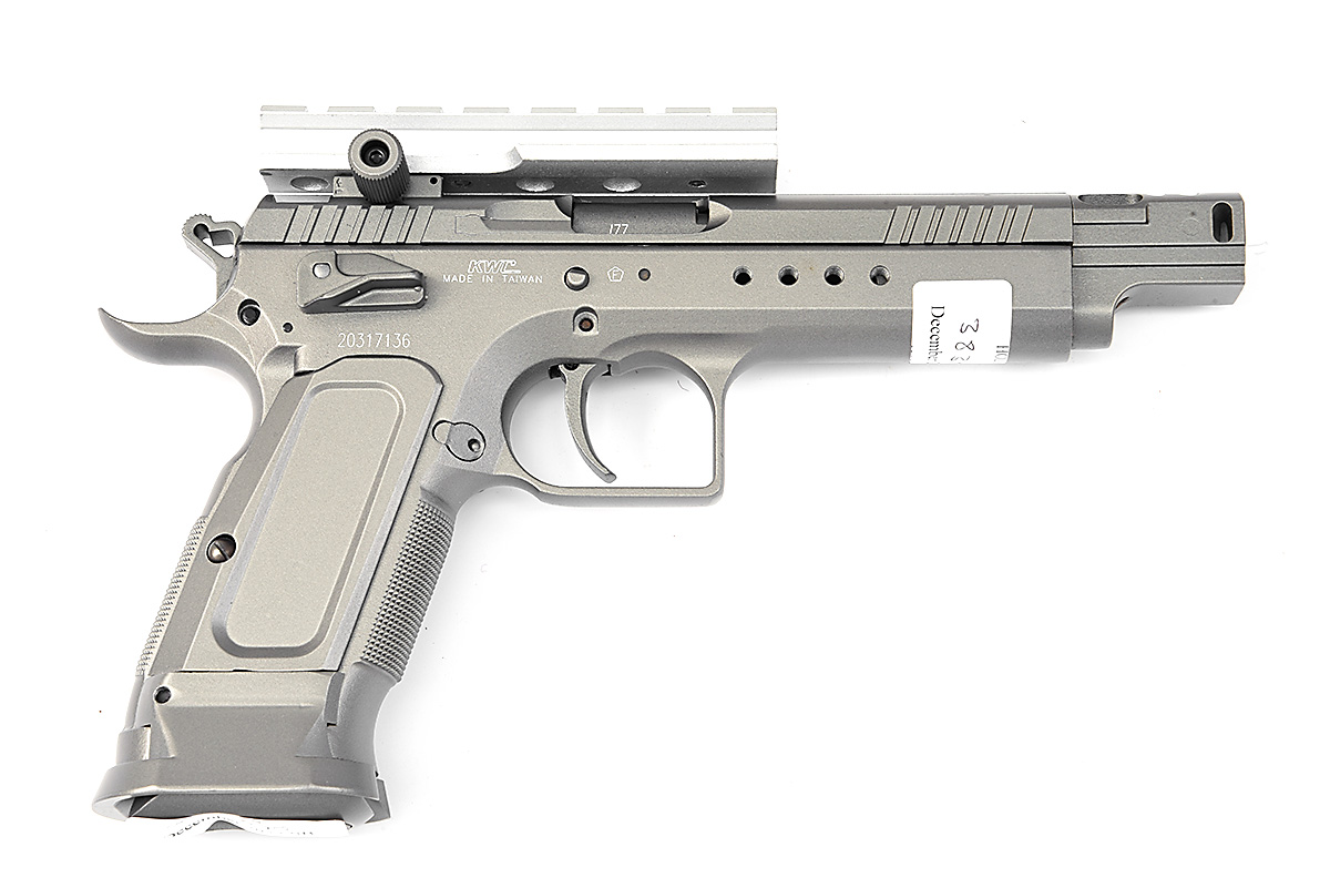 A BOXED .177 CO2 POWERED AIR PISTOL SIGNED TANFOGLIO MODEL GOLD CUSTOM Serial no 20317136 with a 4in. barrel, open sights, top slide lock and safety in a Gun metal Grey finish with a buffed alloy picatinny style accessory rail.