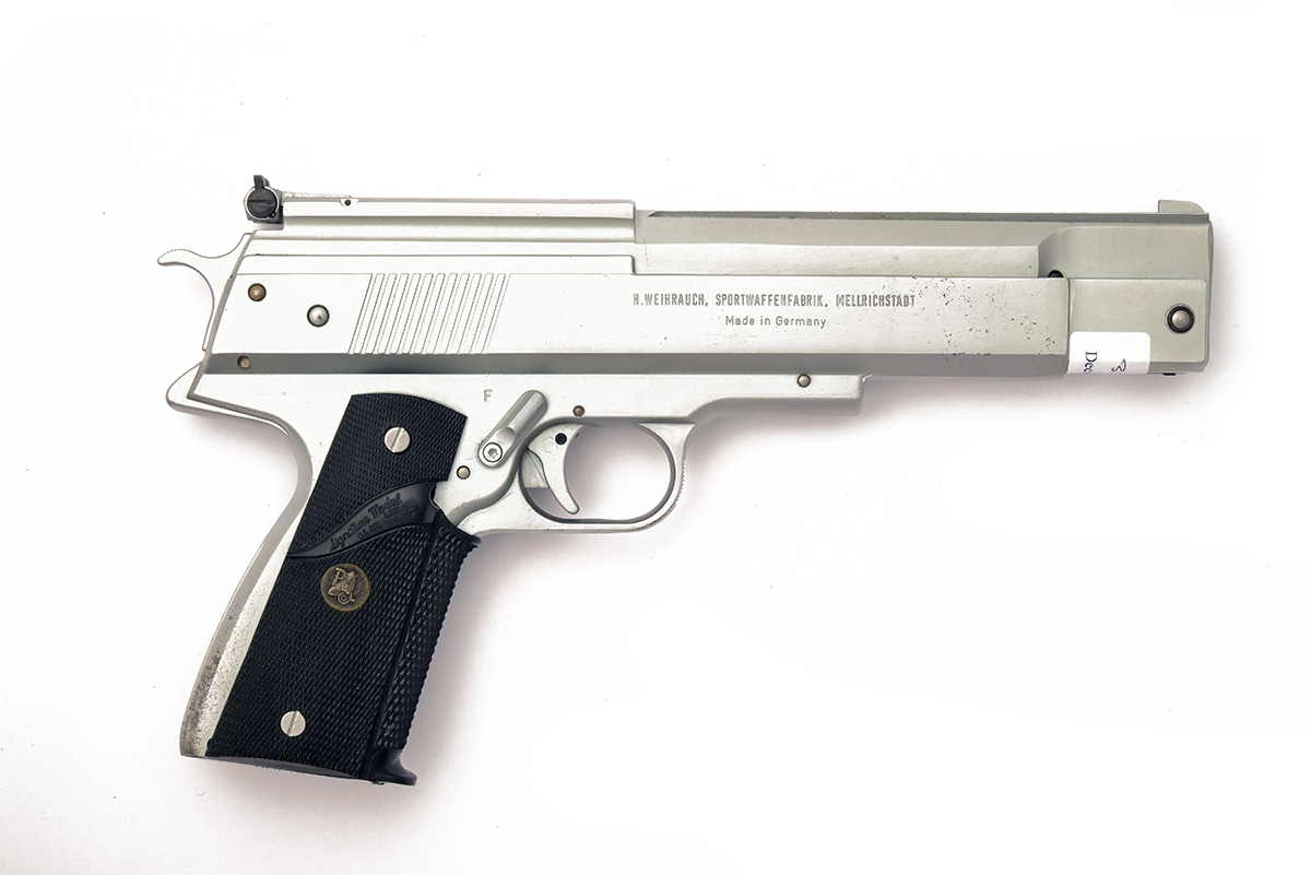 A BOXED .22 BARREL COCKING AIR PISTOL SIGNED WEIHRAUCH MODEL HW45 Serial no 366384 with a 6in. barrel, open sights, satin silver anodised frame and top slide with black Pachmayr grips. In manufacturers original box.