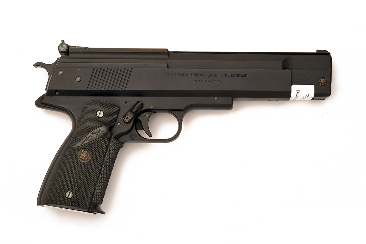 A BOXED .22 BARREL COCKING AIR PISTOL SIGNED WEIHRAUCH MODEL HW45 Serial no 374026 with a 6in. barrel, open sights, black anodised frame and top slide with black Pachmayr grips. In manufacturers original box.