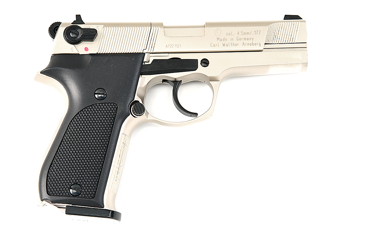 A CASED .177 CO2 POWERED AIR PISTOL SIGNED WALTHER MODEL CP88 Serial no A7221121 with a 4in. barrel, open sights Nickel plate upper and frame, slide lock and top rear safety with black plastic grips.
