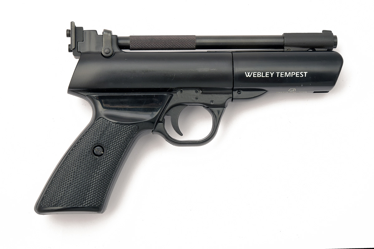 A BOXED .177 BARREL COCKING AIR PISTOL SIGNED WEBLEY & SCOTT MODEL TEMPEST No visible serial number with a 7in. barrel, open sights, black coated alloy frame and ABS plastic ergonomic pistol grip with safety. Appears unused.