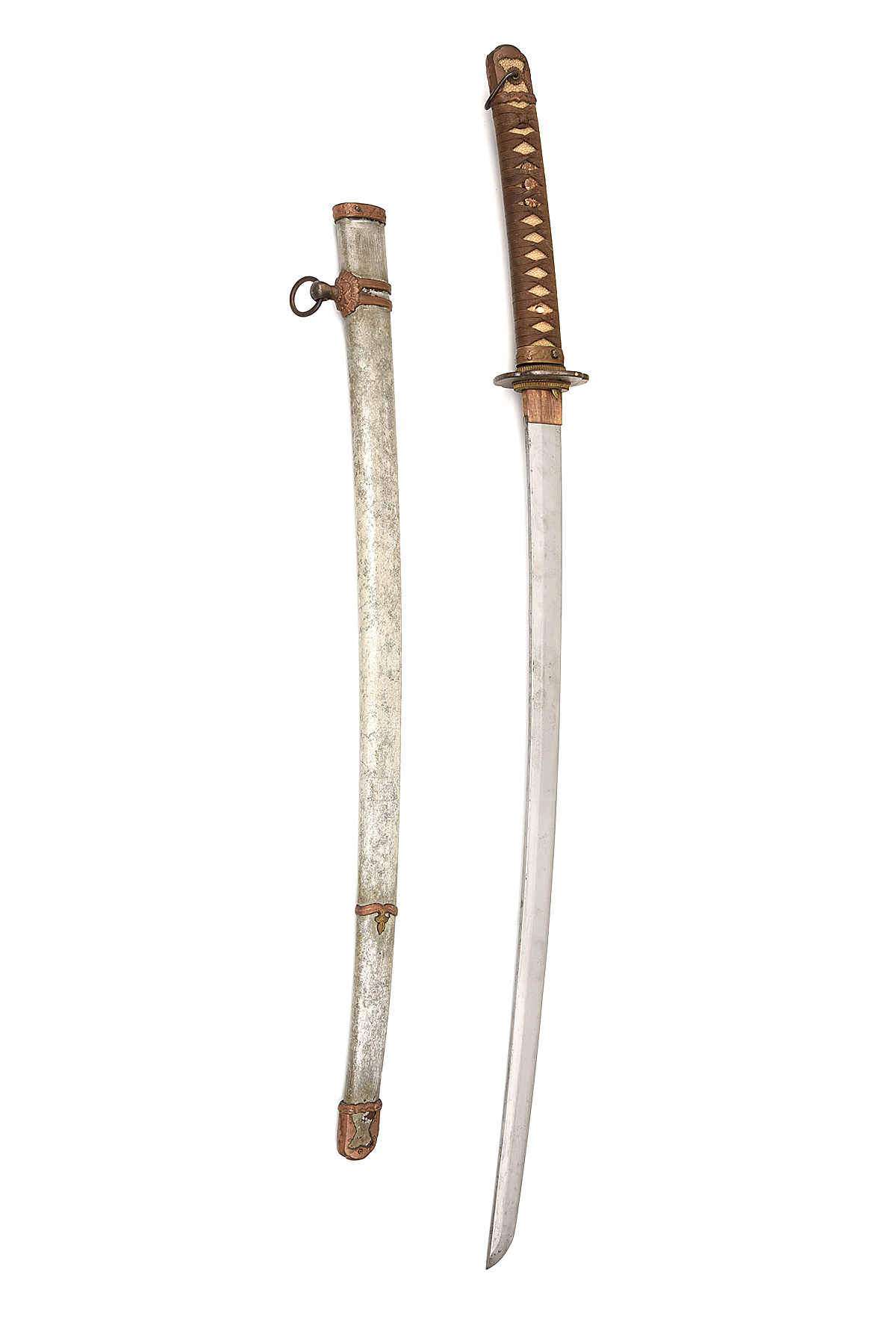 A JAPANESE SHIN-GUNTO MOUNTED OFFICER'S SWORD circa world war two, with 26 1/2in. blade, replacement iron tsuba, cotton wound hilt and alloy scabbard cleaned of finish