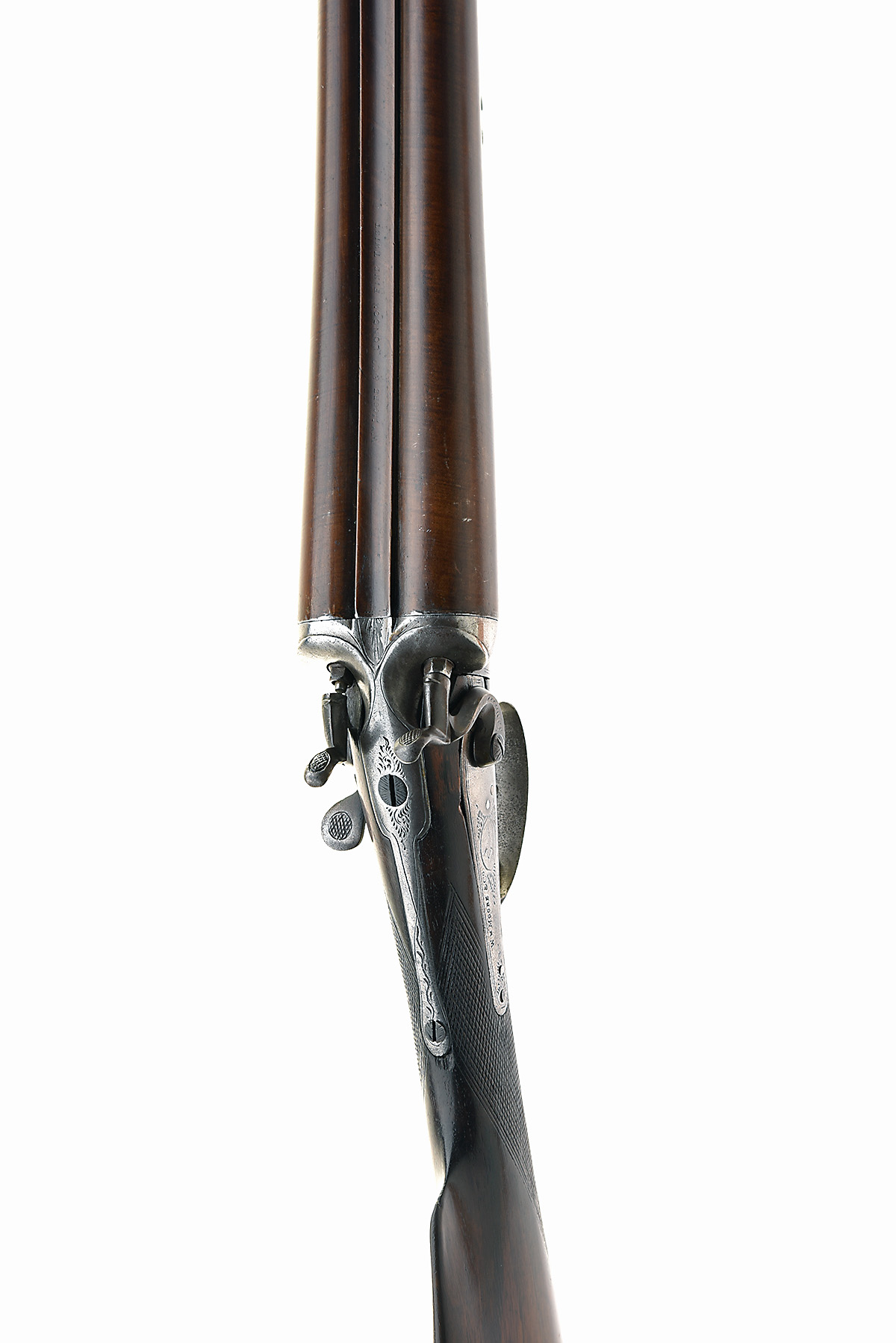 Wm. MOORE & CO. 10-BORE (89MM) SIDELEVER HAMMERGUN, serial no. no visible serial number, circa 1870, 31 3/8in. black powder only reproved twist damascus barrels (in 2025), the rib engraved 'Wm. MOORE & CO. LONDON. FINE TWIST.', 89mm chambers, bored approx. true cyl., sidelever opening, border, acanthus scroll and naive game-scene engraving, brushed bright and re-blued finish, 14 1/4in. stock including steel buttplate, fore-end with cross-pin release catch, weight 9lb. 12oz.