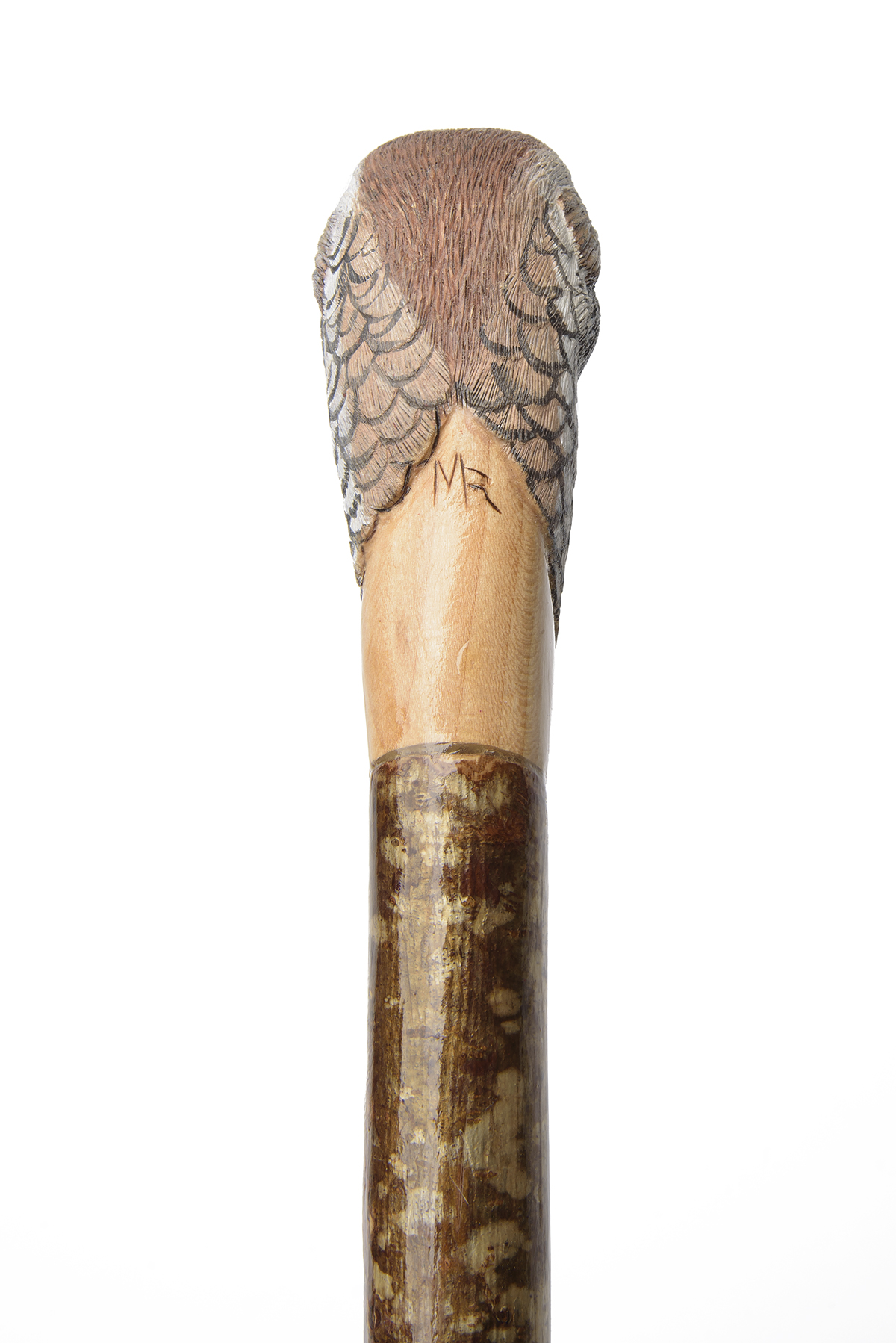 measuring approx. 54in. in length, hardwood shaft, bone ferrule, the head carved and painted in the form of a French partridge