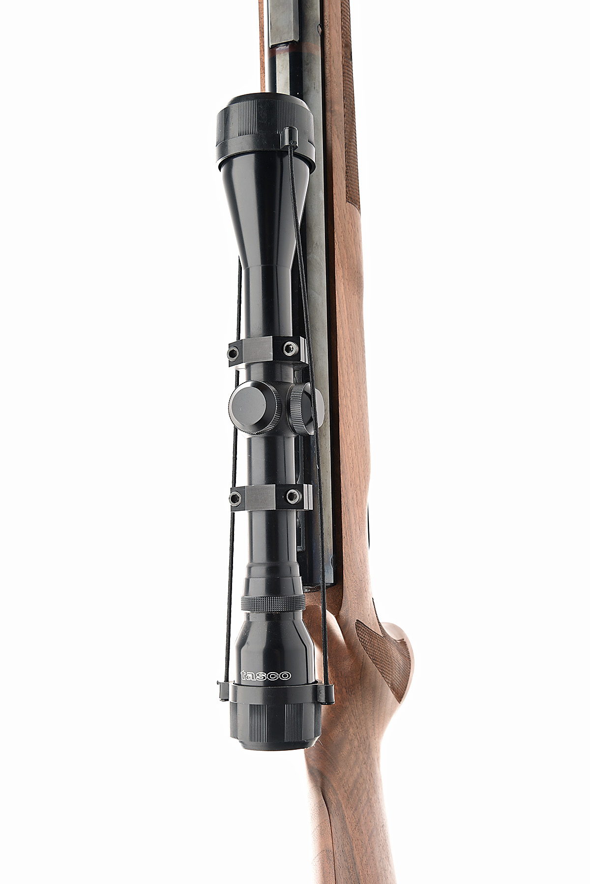 AN FAC RATED .22 BREAK BARREL AIR RIFLE SIGNED THEOBEN MODEL CRUSADER Serial no T3523 with a 19.5in. barrel including silencer, a Tasco 4x40 telescopic sight, trigger guard safety in a right hand Walnut stock.