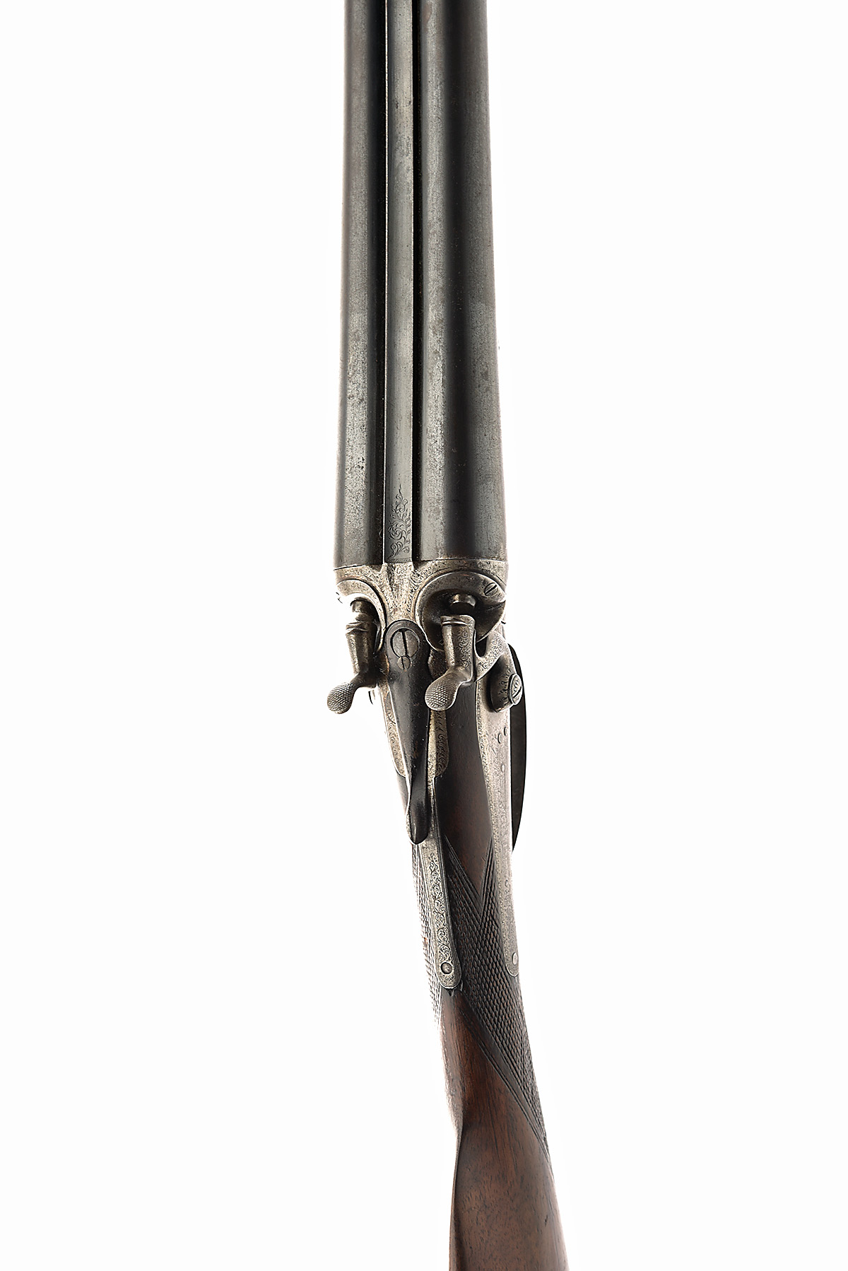 W. RICHARDS 12-BORE TOPLEVER HAMMERGUN, serial no. 7494, for 1882, 30in. sleeved nitro barrels, 2 1/2in. chambers, bored approx. 1/2 and full choke, carved serpentine fences, rebounding back-action sidelocks, border and partial scroll engraving, surrounding vignettes of hound flushing partridge and pheasant, bright finish, 14 1/2in. figured stock, Hackett-type snap-on fore-end with horn finial
