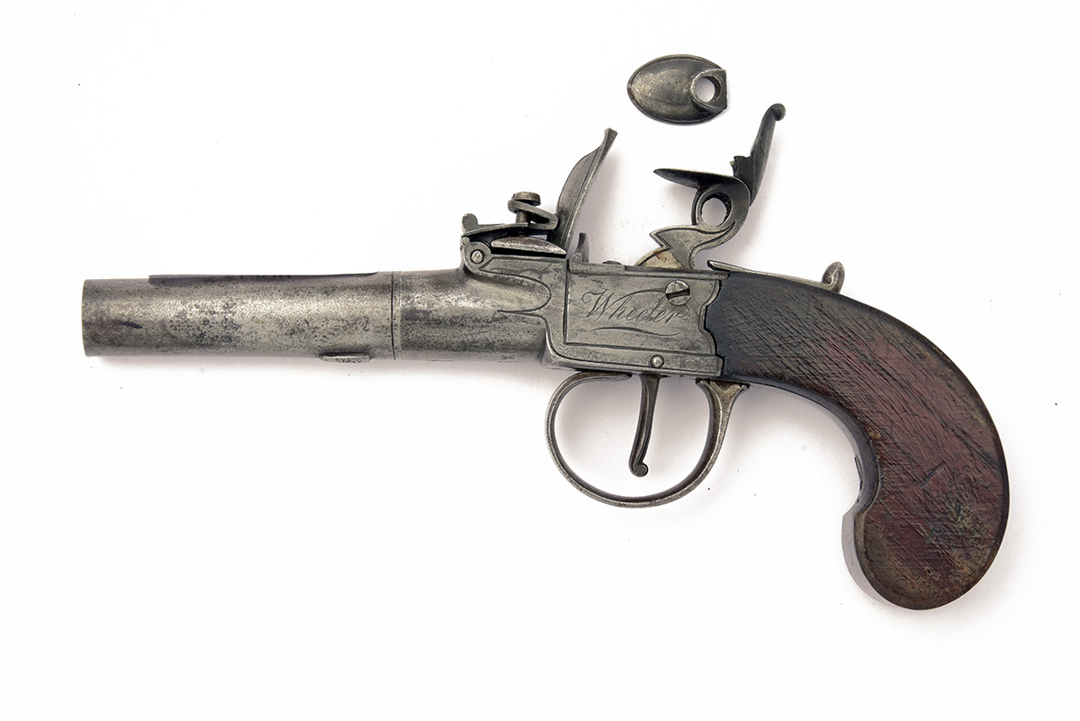 A 54-BORE FLINTLOCK POCKET-PISTOL SIGNED WHEELER, no visible serial number,
