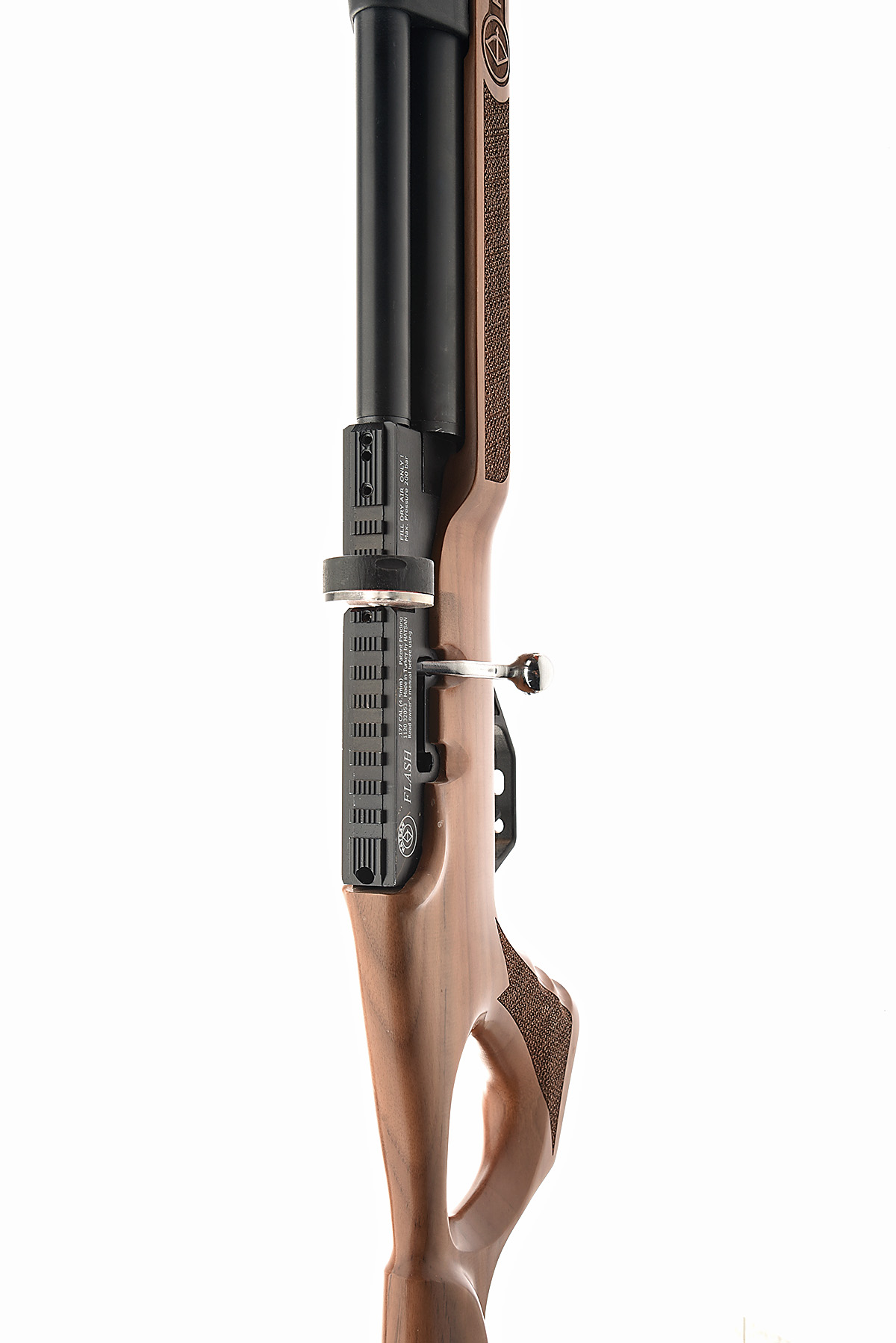 A .177 PRE-CHARGED PNEUMATIC AIR-RIFLE, SIGNED HATSAN 'MODEL FLASH', serial no. 1120 32053, 24 1/4in. unsighted barrel with integral sound moderator, receiver with integral sight rail, bolt-action, detachable rotary magazine (present), manual safety, skeletal pistolgrip halfstock, 14 1/4in. pull including ventilated rubber recoil pad
