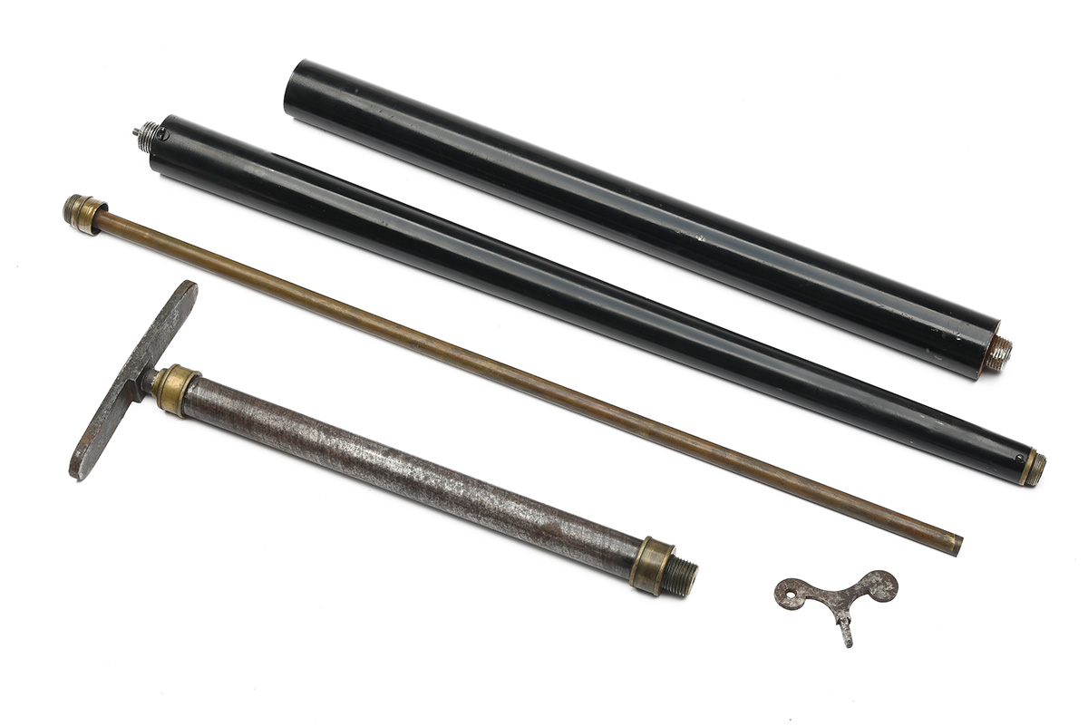 circa 1880, with black enamelled 19 1/2in. smoothbore muzzle-loading 54-bore barrel-section with detachable 180-bore rifled liner, diminutive open sights and concealed button trigger, aperture for cocking key (included), straight enamelled air reservoir threaded at end for a pommel (absent), much finish and traces of colour, in a period velvet-lined walnut casing adapted for this cane storing the rifled barrel out of the main body and complete with a laminated pump signed 'E. & W. BOND 45 CORNHILL LONDON', wooden rammer, the original cocking key and a spare valve stem