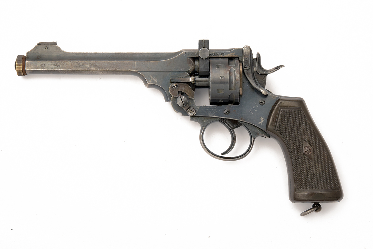 A .455 WEBLEY & SCOTT MKVI SERVICE REVOLVER FITTED WITH AN A.G PARKER .22 (L/R) SIX-SHOT CONVERTER, serial no. 188650, the revolver dated for 1916, with blued 6in. barrel, break open frame and chequered hard rubber grips, missing .455 cylinder, in a later incorrect Pattern '37 webbing holster