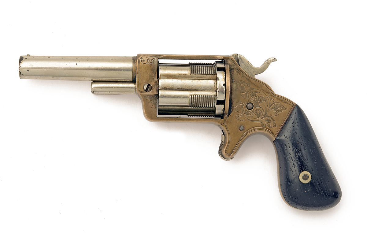circa 1864, with nickel-plated round 3in. barrel, the top with bead fore-sight and signed B.A. CO. PATENT APRIL 14TH 1863', borderline engraved brass frame with scroll engraving to the action sides, nickel-plated cylinder with separate sliding tube chambers, fixed ejector rod and smooth semi bag-shaped walnut grips, chequered spur trigger, much plated finish remaining where appropriate