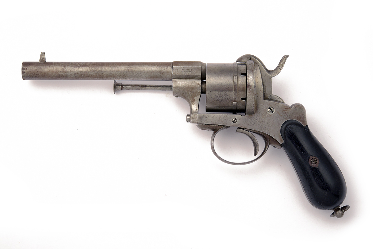 A FRENCH 12mm DOUBLE-ACTION PINFIRE REVOLVER SIGNED St ETIENNE, no visible serial number, circa 1870. with sighted round and octagonal 6 1/4 in. barrel marked 'MOUVEMENT / AGIER' and 'FABRIQUE / DE St ETIENNE', six-shot cylinder marked with St Etienne proof-mark and 'AGIER FONt U', open frame, hinged loading gate, cartridge extractor, ebony grips, lanyard ring, trigger-guard, cleaned of finish, trigger return spring at fault, 12 in. overall