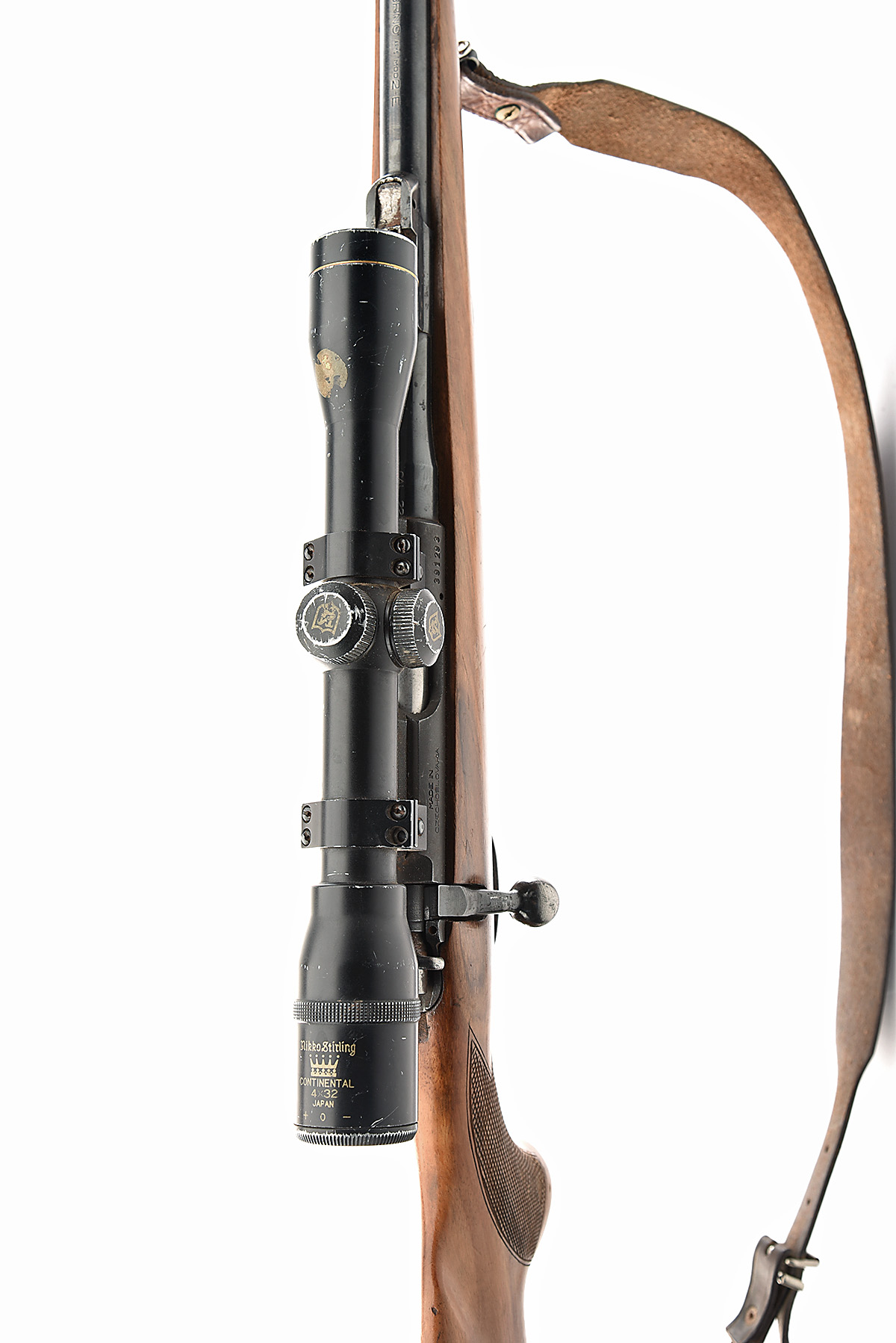 BRNO .22 L.R. 'MODEL 2-E' BOLT-MAGAZINE SPORTING RIFLE, serial no. 391293, circa 1988, 24 3/4in. nitro barrel, threaded for sound moderator, fore-sight missing, fitted with a Nikko Stirling 4x32 telescopic sight, manual safety, detachable magazine, pistolgrip stock, leather sling