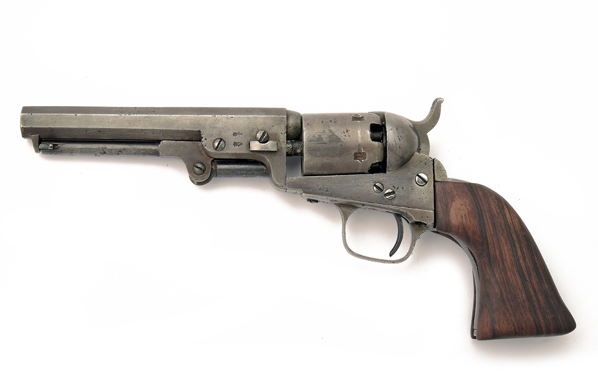 A UNITED STATES .31 PERCUSSION COLT MODEL 1849 LONDON 'POCKET', serial number 1942, 1850, with 5 in octagonal barrel, top flat marked 'ADDRESS COL. COLT / LONDON'. 5-shot cylinder, open steel frame with London proofs, under-barrel rammer, wooden grips, together with a black leather holster, visible serials are matching, heavily worn, scrubbed of all finish, traces of frame script only, no visible cylinder scene, front sight filed down, action at fault, replaced grips, 12 in. overall with holster
