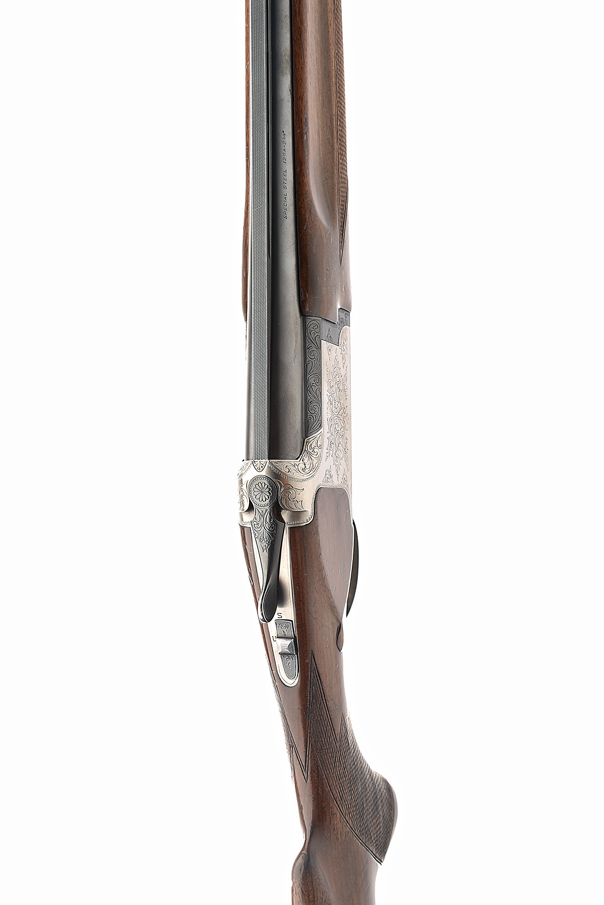 MIROKU FIREARMS MFG. CO. 12-BORE SINGLE-TRIGGER OVER AND UNDER EJECTOR, serial no. 2277227, circa 1978, 28in. nitro barrels with 7mm ventilated matt top-rib, 2 3/4in. chambers, bored approx. 1/2 and full choke, hold-open toplever, automatic safety with integral barrel selector switch, gold-washed single trigger, beaded border and acanthus scroll engraving, 14 1/4in. pistolgrip stock including buttplate, weight 6lb. 15oz.