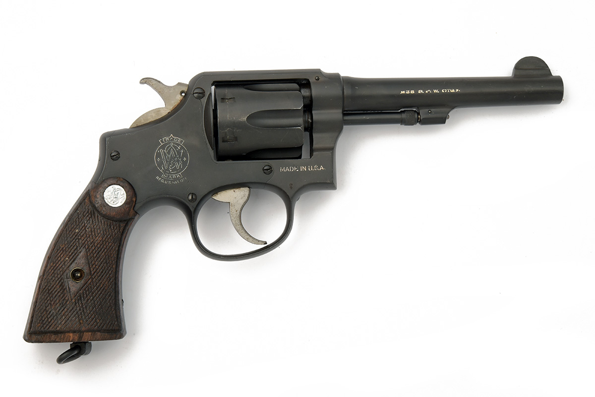 A .38 (S&W) VICTORY MODEL REVOLVER BY SMITH & WESSON, serial no. 784036, with 5in. barrel, swing-out fluted cylinder, chequered walnut grip and solid frame, refinished