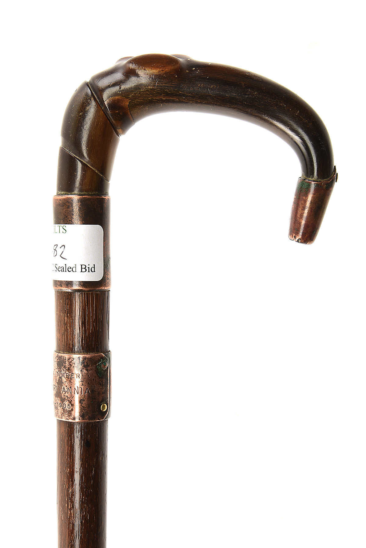 A VINTAGE HORN HANDLED WALKING STICK WITH MOUNTS FORMED FROM COPPER FROM H.M.S BRITANNIA, 30 1/4in. long, the moulded horn handle with a copper tip, copper ferrule to the shaft and central band engraved 'MADE FROM COPPER & TIMBER TAKEN FROM 'H.M.S. BRITANNIA', DARTMOUTH 1869-1905'