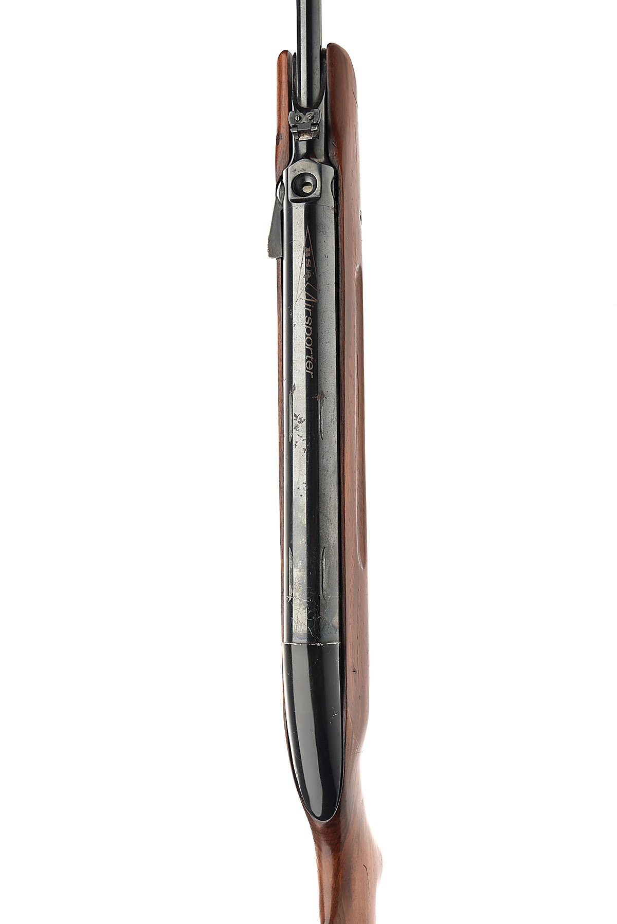 A .22 BSA AIRSPORTER MKII AIR-RIFLE, serial no. erased, with blued 18in. sighted barrel, plain air-chamber with automatic loading tap, clear etched trademark and two-part telescopic sight rails, slanted air-chamber and three-piece laminated walnut half-stock, fair condition for collectors, missing front stock-screw