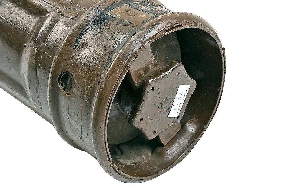 dated 1979, steel construction complete with inner case lining, painted brown with yellow stencilling indicating UN use, '1 RD 105mm UN', 9 in. diameter, 43 3/4 in. length