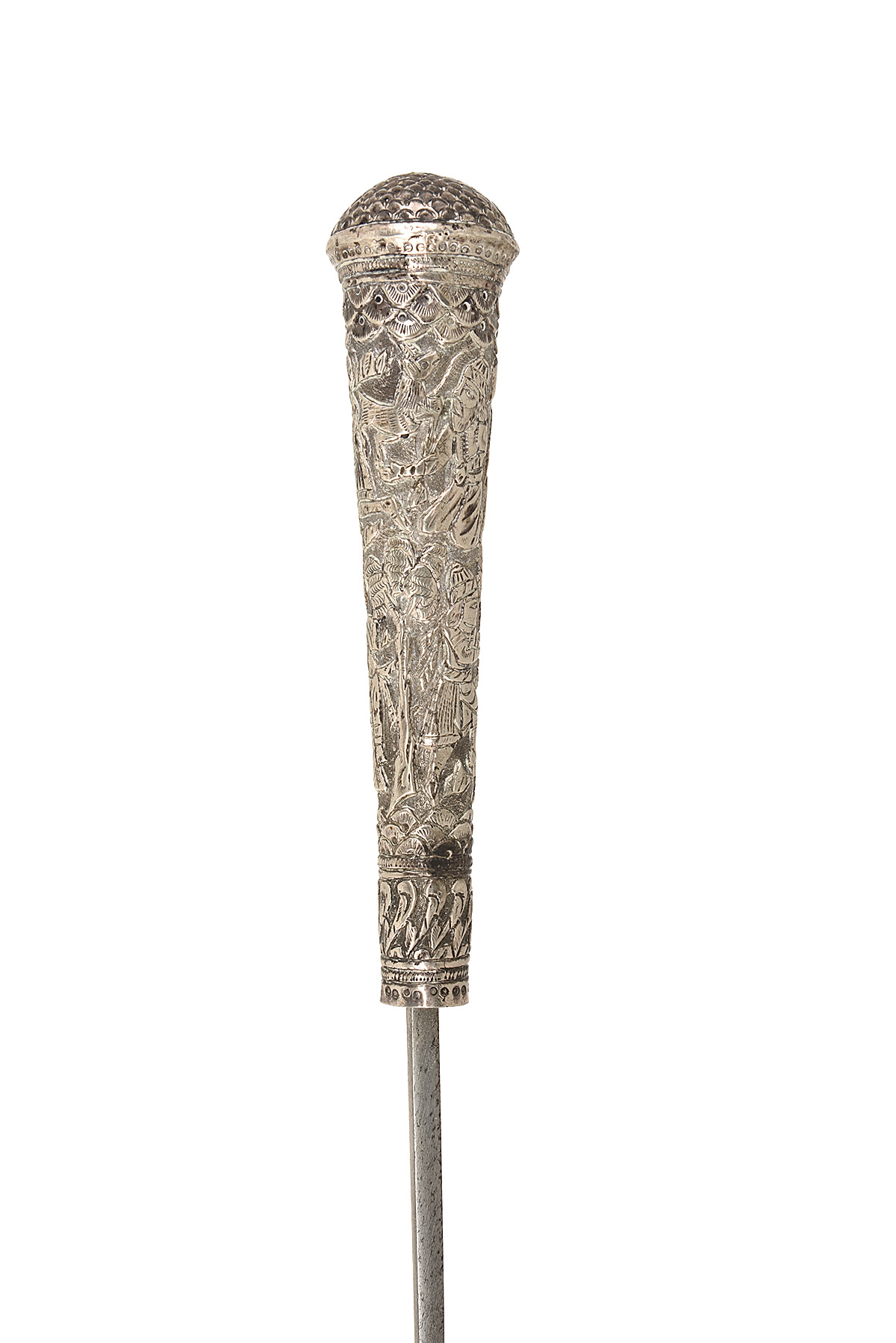 AN INDO-PERSIAN WHITE METAL MOUNTED SWORDSTICK, early 20th Century, white metal handle with rounded pommel, depicting stylised figures and animals extending 5 1/2 in. down the cane, brass ferrule with steel heel, 27 in. square steel blade, 35 in. overall