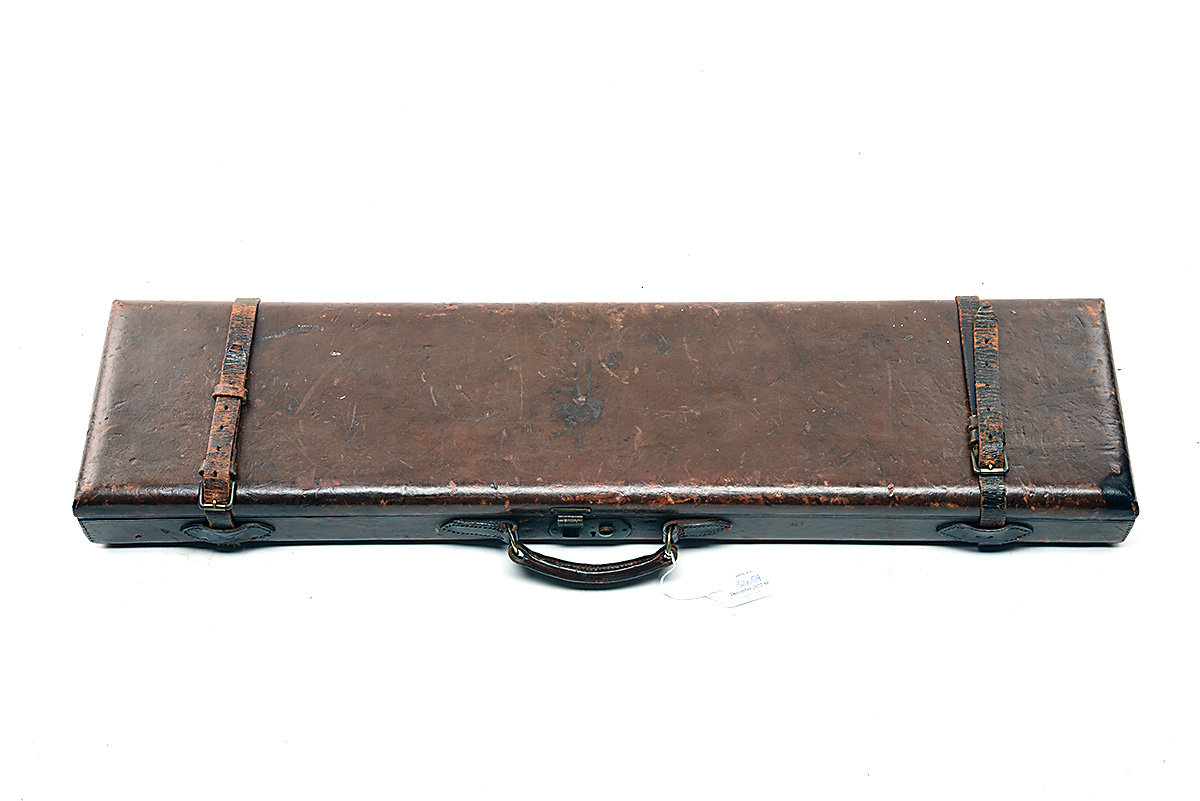 A LEATHER SINGLE LIGHTWEIGHT GUNCASE, fitted for 30in. barrels, the interior lined with green baize, brass lock (key missing)