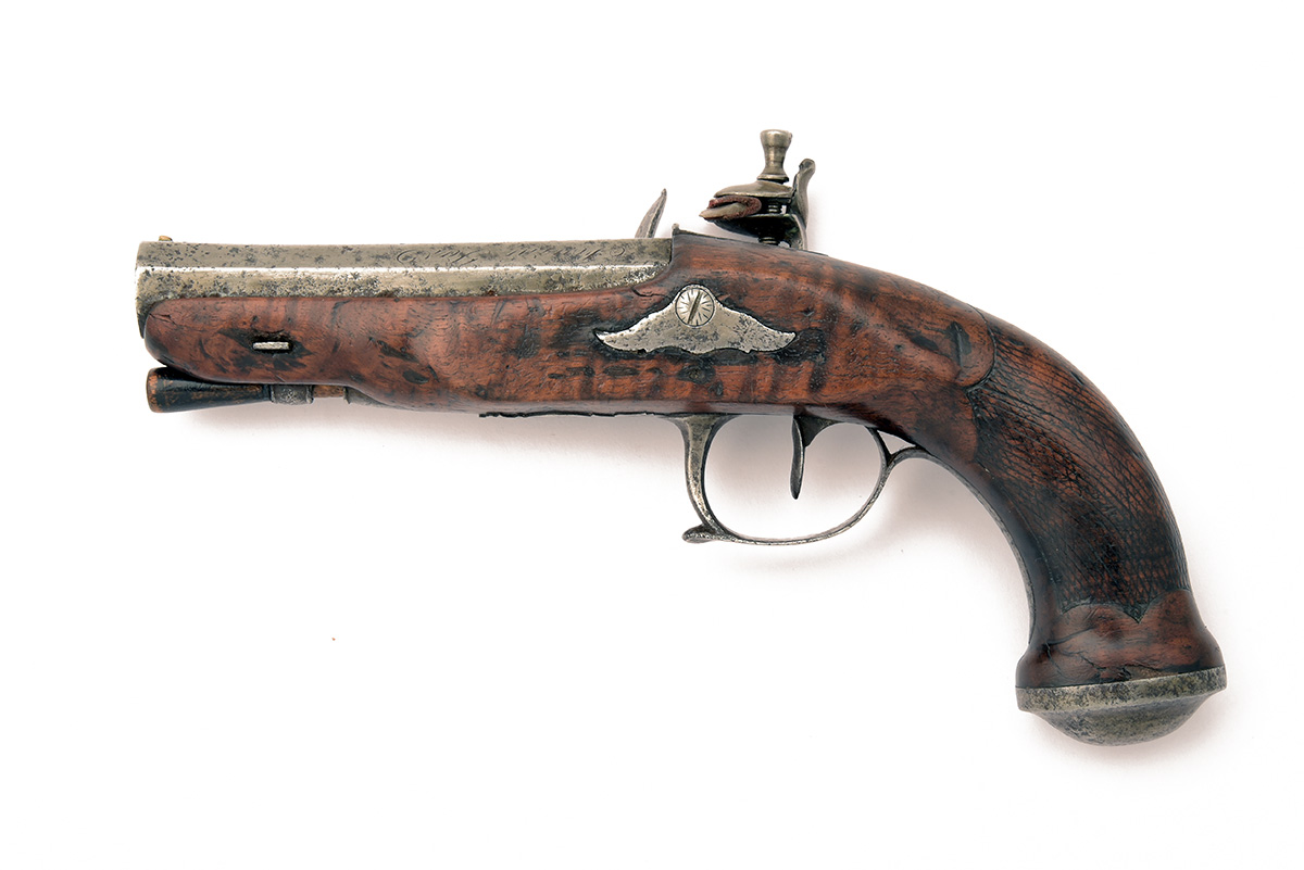 A FRENCH 25-BORE FLINTLOCK PISTOL SIGNED FOURNI PAR FIRNEL A PARIS, no visible serial number, circa 1800, with 4 in. rifled octagonal sighted steel barrel engraved 'Fourni Par / Firnel a Paris', steel lock with 'waterproof' pan, walnut stock with chequered grips, steel furniture, wooden rammer, actions correctly, worn, all steel with heavily cleaned pitting, engraving indistinct, 9 1/4 in. overall