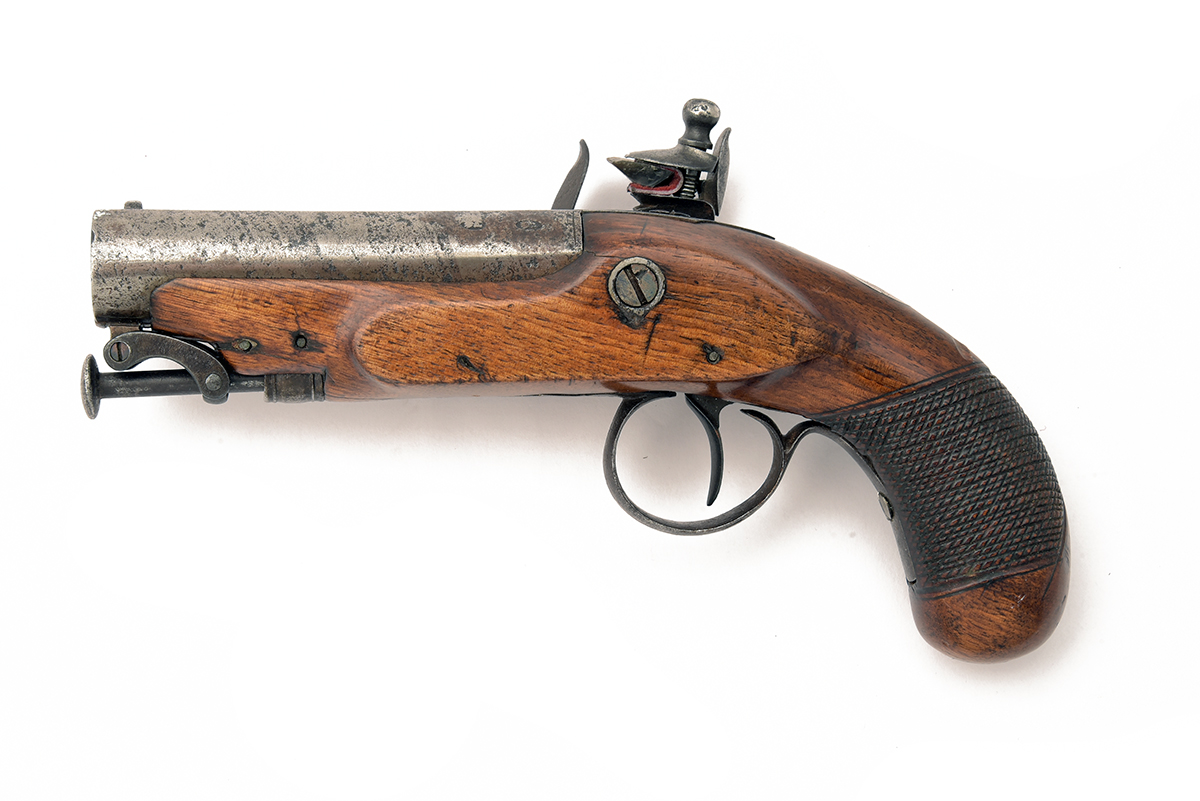 A .580 FLINTLOCK TRAVELLING PISTOL, POSSIBLY SIGNED WIER, no visible serial number, circa 1810, with sighted octagonal 3 1/2 in. steel barrel with London proofs and indistinctly engraved, steel lock with engraved foliage decoration, possibly signed 'WIER', sliding safety, walnut stock with chequered grip, inset oval white metal escutcheon engraved with initials and inset white metal butt-cap with engraved sunburst, steel trigger-guard, steel captive rammer, functions correctly, barrel heavily cleaned with pitting, other steel pitted, stock cracks around throat pipe, 7 3/4 in. overall