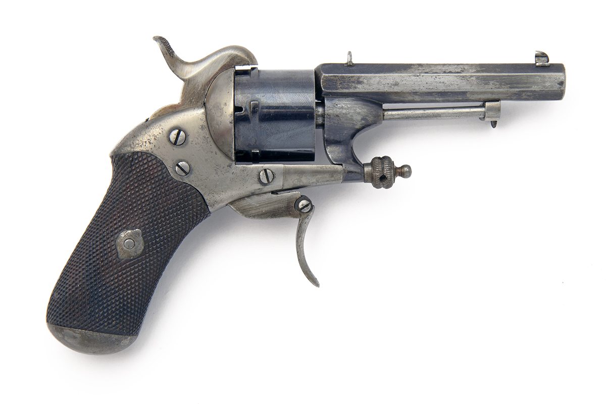 Belgian, circa 1860, with blued 3in. octagonal barrel signed on the left side-flat 'CHAMELOT & DELVIGNE, INV & BTE', plain blued ratchet-locking cylinder, open moulded iron frame, unusual rear-hinged left hand loading gate, offset hammer, chequered walnut bag-shaped grips, domed iron butt-cap, folding double action trigger, sliding ejector rod with under-barrel guide-bar, the whole retaining much original blued finish and traces of colour and complete with a black leatherette case with stud-work edging and lined and compartmented in blue velvet for this revolver with lidded compartments for accessories