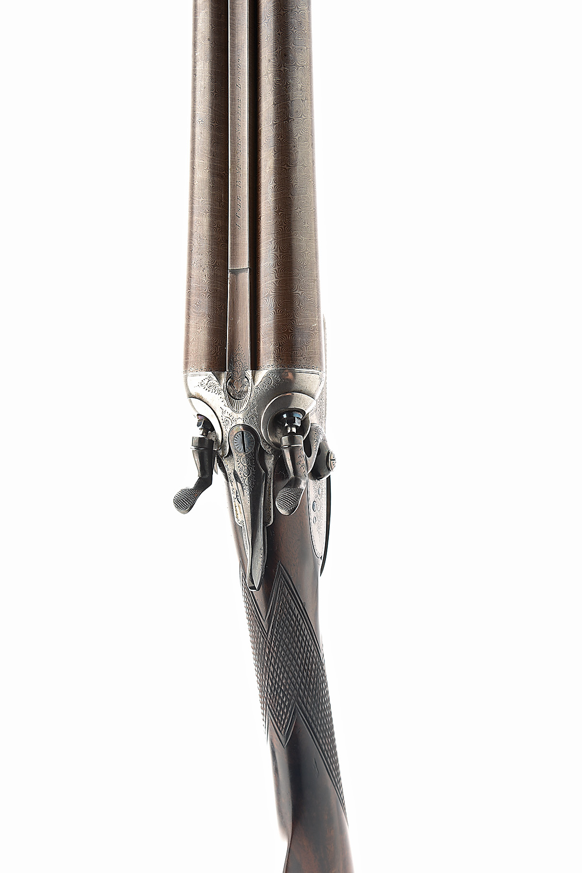 J. COLE 12-BORE TOPLEVER HAMMERGUN, serial no. 6944, circa 1887, 29 7/8in. nitro reproved bold damascus barrels, the rib engraved 'J. COLE 13 NEWMAN STREET. LONDON.', 2 1/2in. chambers, bored approx. true cyl. and 3/4 choke, treble-grip action, carved percussion fences, rebounding sidelocks, border and scroll engraving, 14 1/4in. figured stock with steel heel and toe plates, weight 6lb.